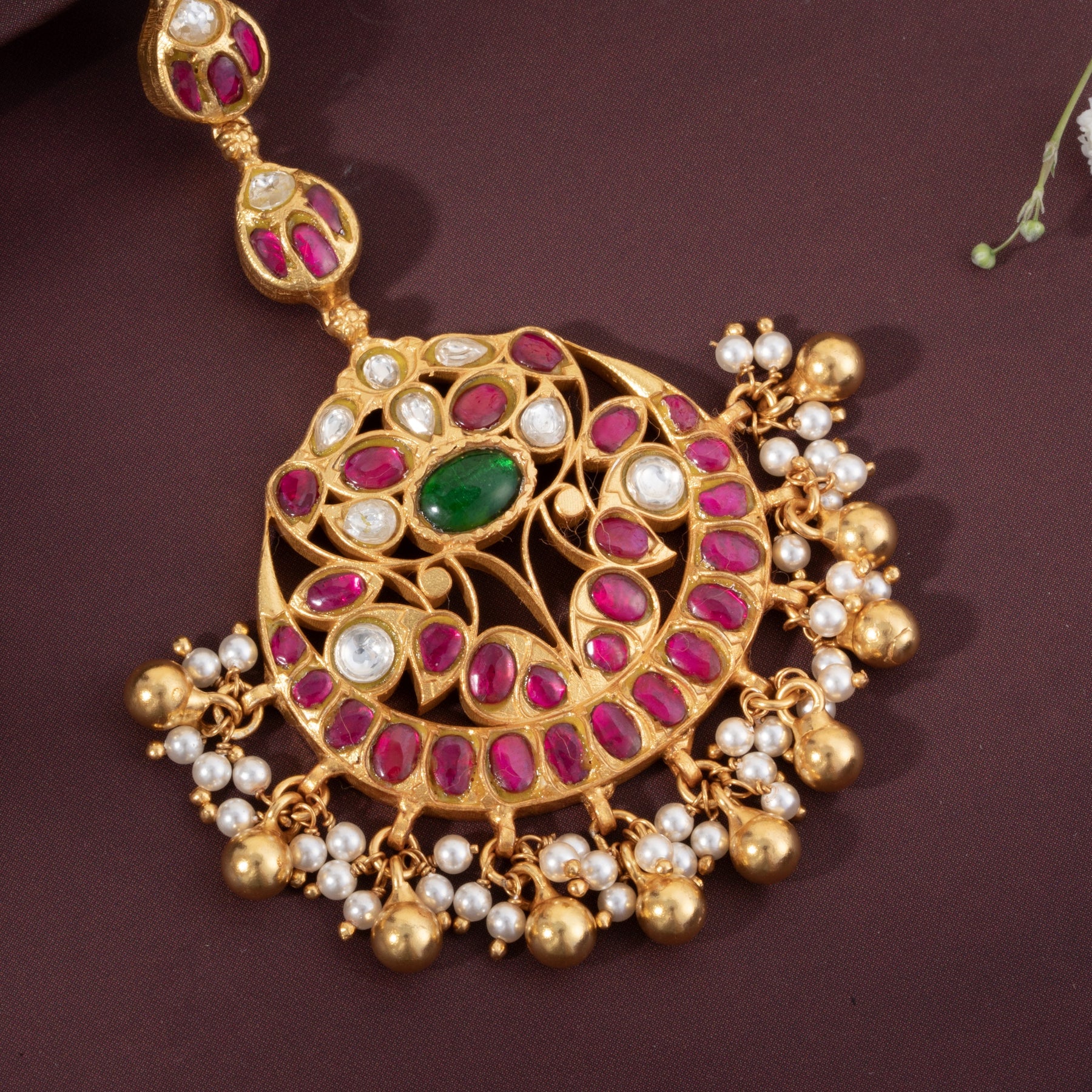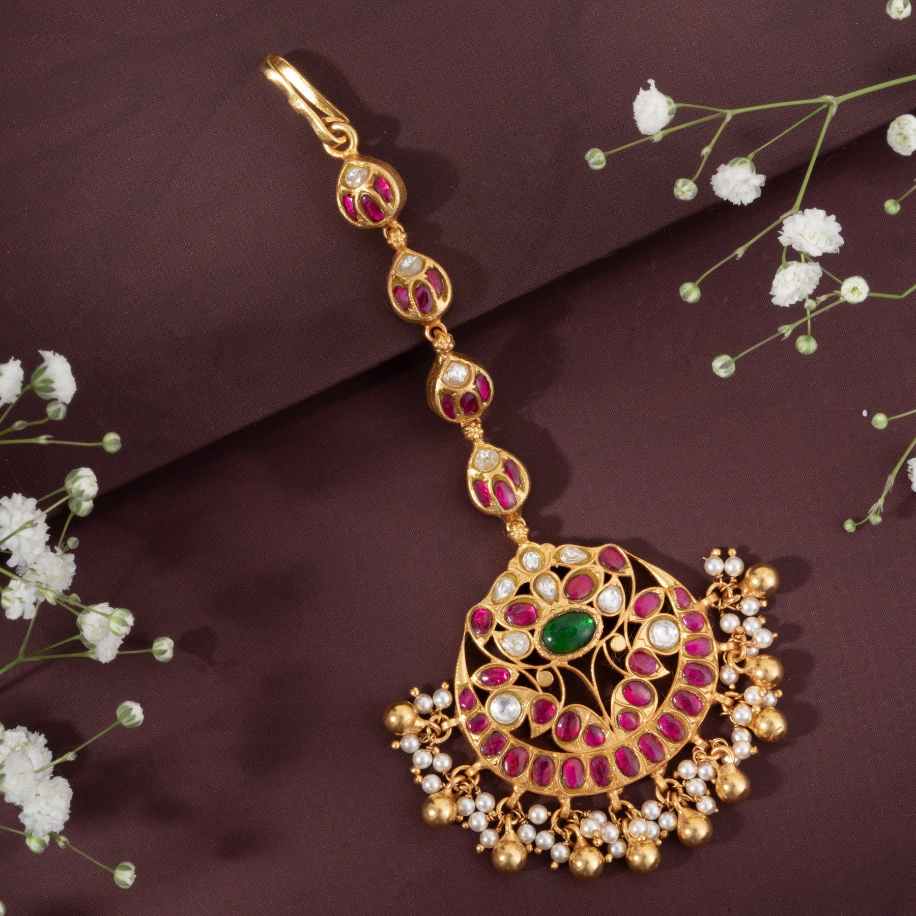 The Amritphool Maang Tikka showcases exquisite craftsmanship with its intricate Floral design adorned with Kundan settings. Featuring lustrous Rubies and Emeralds set against a backdrop of delicate Pearls and Golden bead hangings, this piece combines traditional artistry with timeless elegance. Each element is carefully positioned to create a harmonious blend of colour and radiance, making it an ideal choice for weddings, festivals, and special occasions. The Kundan work ensures durability while maintaining the authentic aesthetic of jewellery.