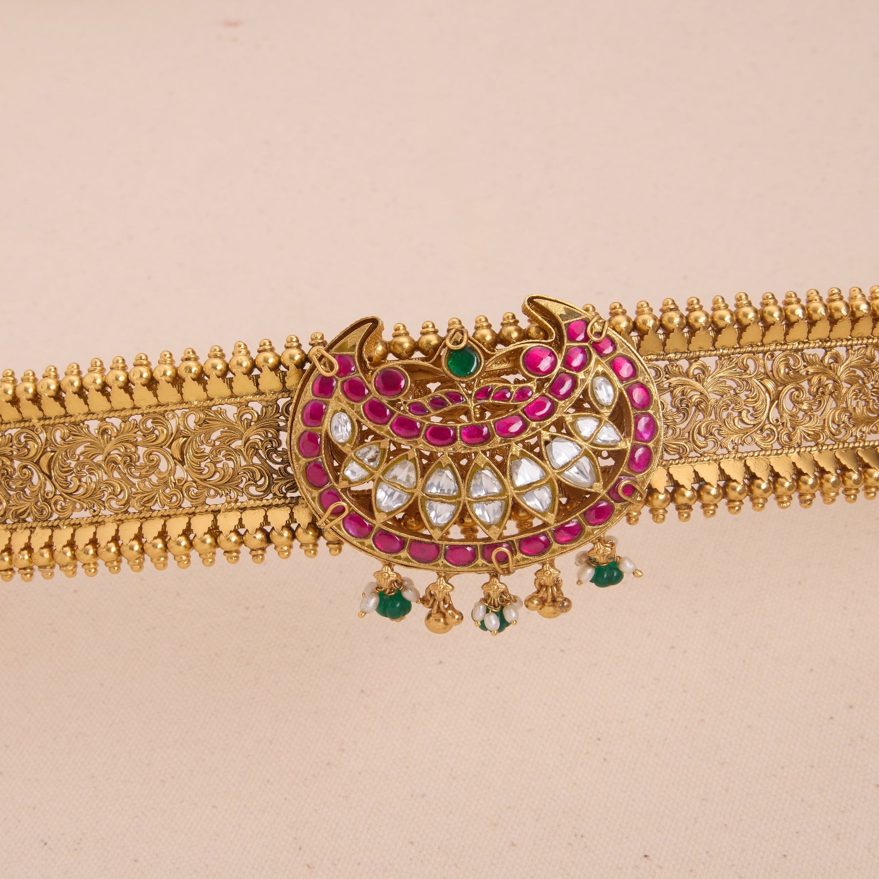 Chandralaya Oddiyanam features a refined Half-Moon design adorned with intricate Kundan settings, enhanced by vibrant rubies and delicate Golden beads. Emerald hangings add a striking contrast, creating a harmonious blend of traditional craftsmanship and elegance. This piece exemplifies expert artistry, making it a distinguished accessory for special occasions.