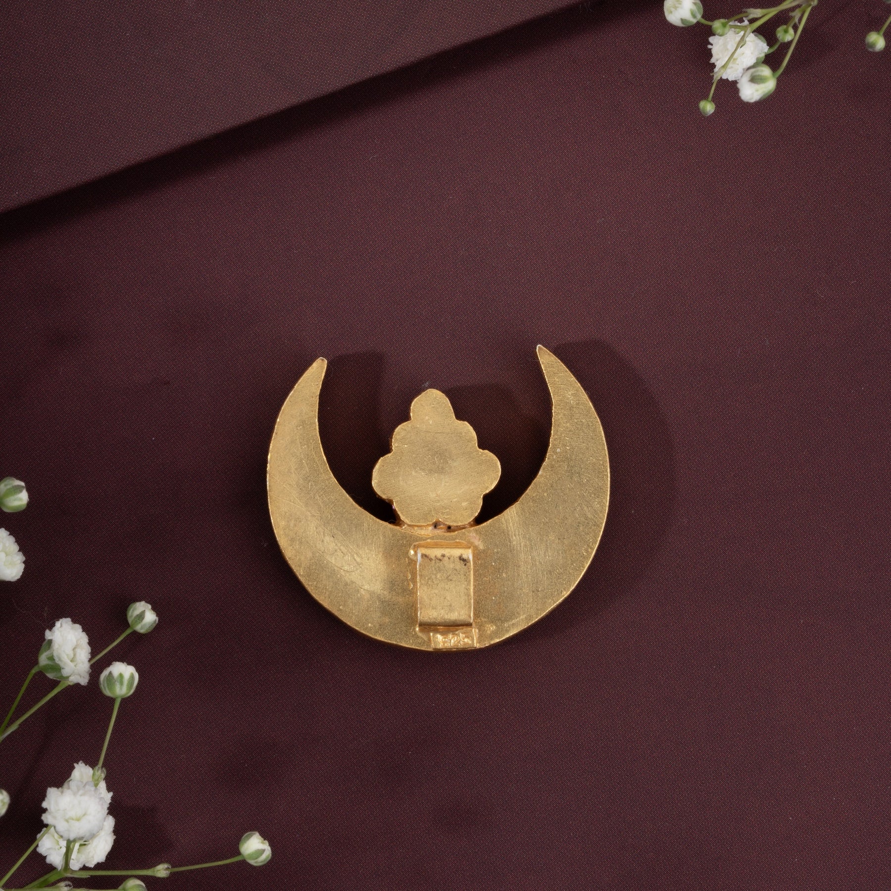 The Chandravali Brooch captures celestial elegance with its distinctive Half-Moon silhouette, adorned with intricate Kundan settings that frame lustrous Emerald and Ruby gemstones. Each stone is meticulously positioned to create a harmonious interplay of deep green and rich crimson hues, reflecting traditional craftsmanship. The Kundan technique ensures secure stone placement while adding dimensional depth to the design. Perfect for elevating formal attire or traditional ensembles, this brooch serves as a sophisticated accessory that blends heritage artistry with timeless appeal.