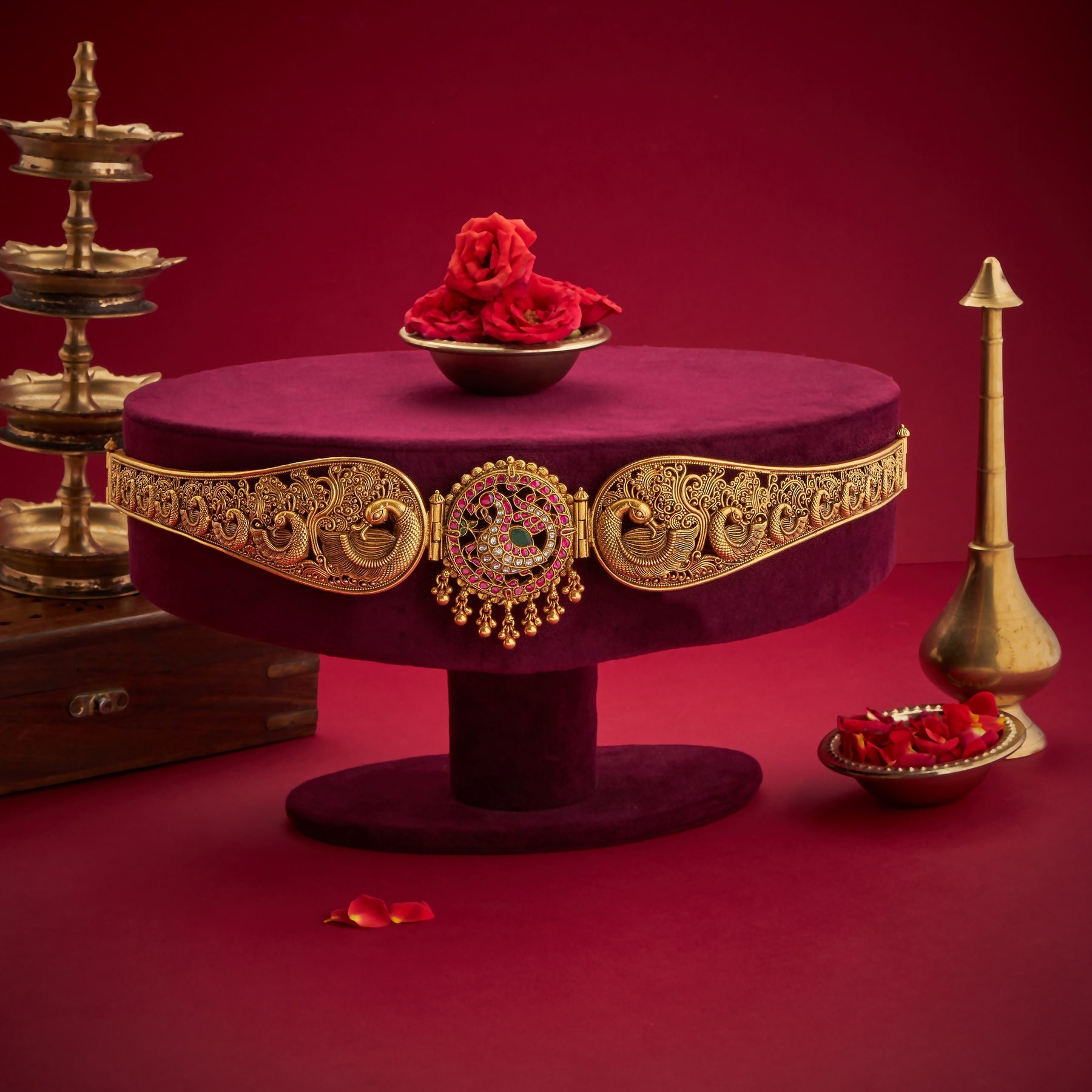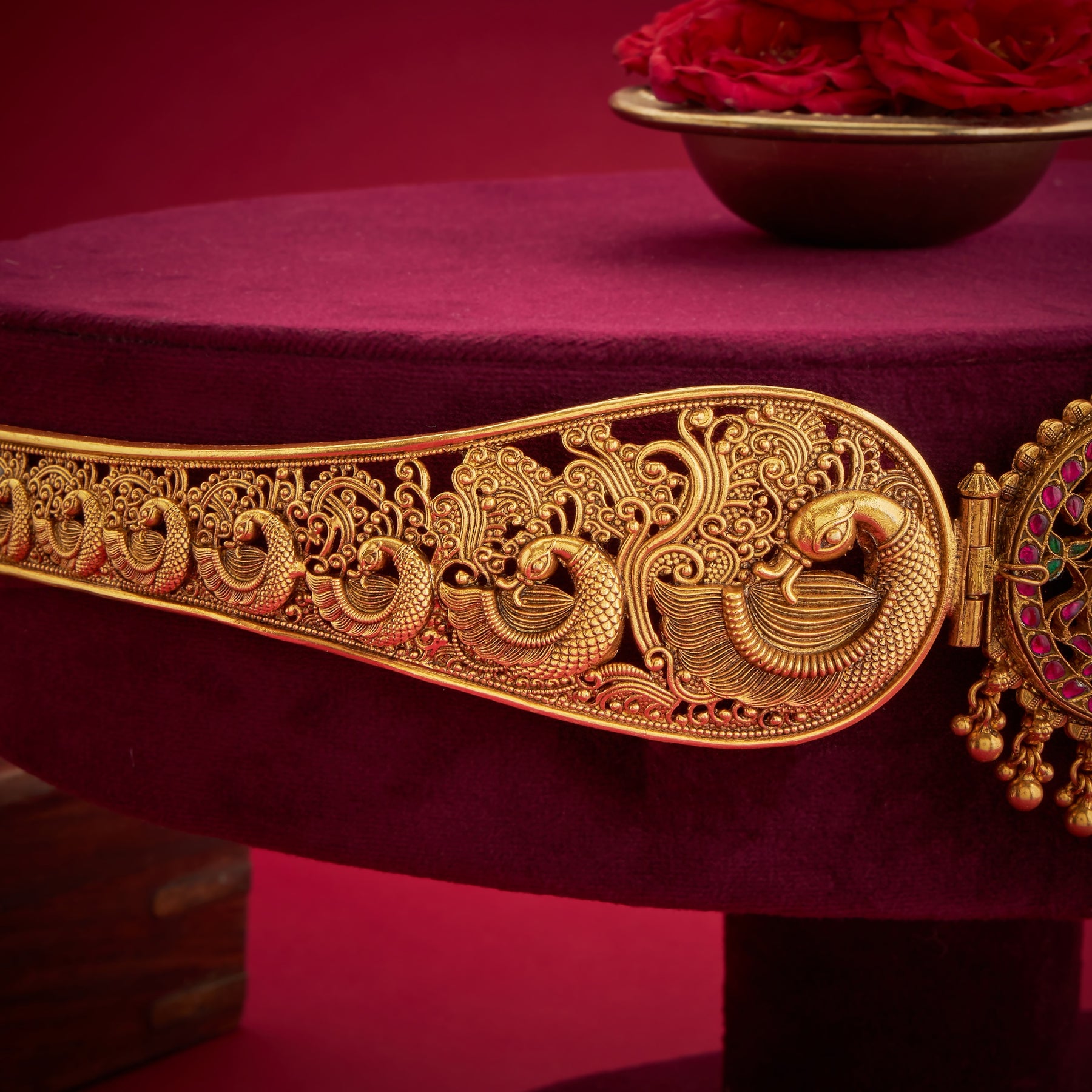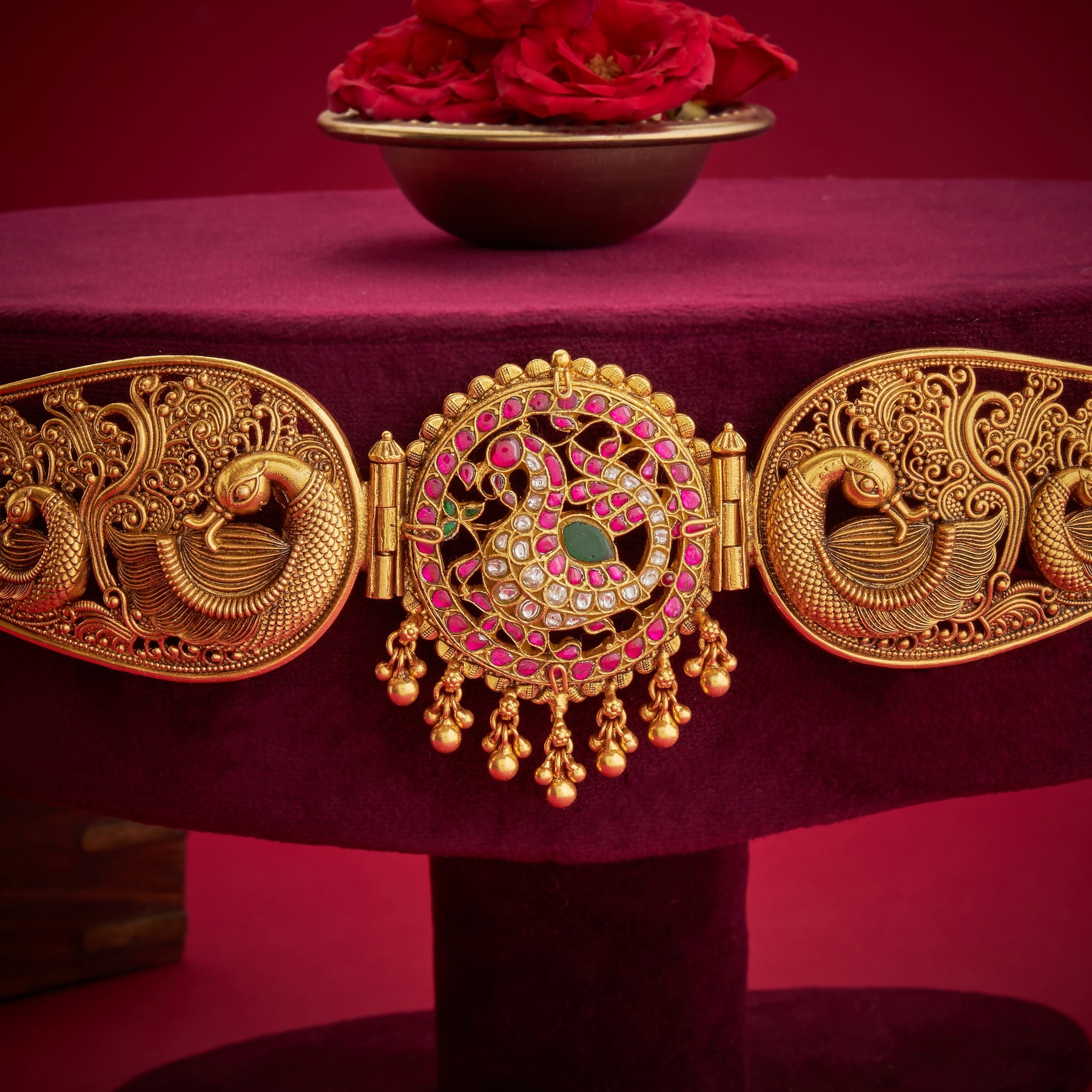 Jharokha Mor Oddiyanam showcases exquisite craftsmanship with intricate Peacock motifs that capture the grace of traditional Indian design. Each piece features Kundan settings adorned with rich Rubies and Emeralds, complemented by delicate Golden bead drops that create movement and elegance. The combination of semi precious gemstones and fine metalwork makes this waist ornament a statement piece for festive occasions and celebrations. Perfect for those who appreciate authentic artisanal jewellery with timeless appeal.