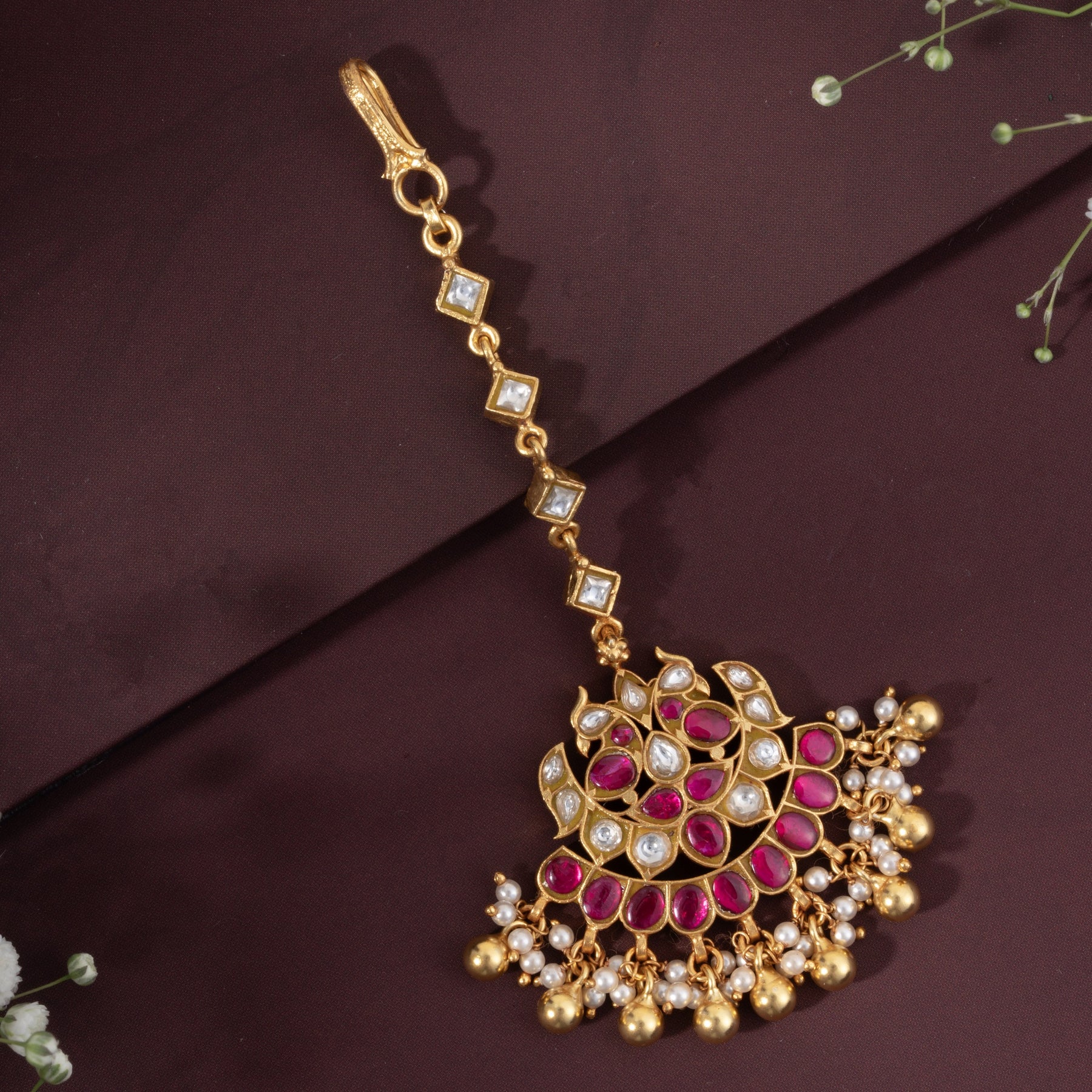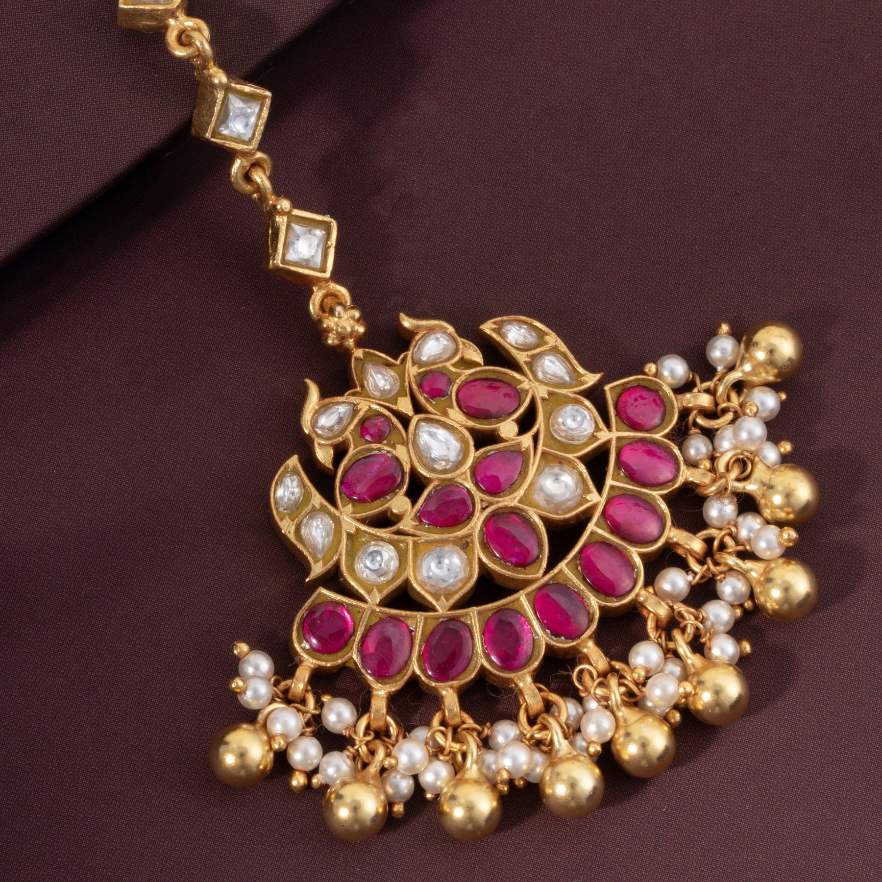 Mora Mukula Maang Tikka showcases exquisite craftsmanship with a stunning Peacock motif adorned with Kundan settings. The design features rich Ruby stones complemented by lustrous Pearls and delicate Golden bead hangings that cascade gracefully. This traditional piece combines timeless elegance with intricate detailing, making it an ideal choice for weddings, festivals, and special occasions. The Kundan work ensures durability while maintaining the authentic aesthetic of classic Indian jewellery. Perfect for those seeking a statement maang tikka that blends heritage artistry with refined sophistication.