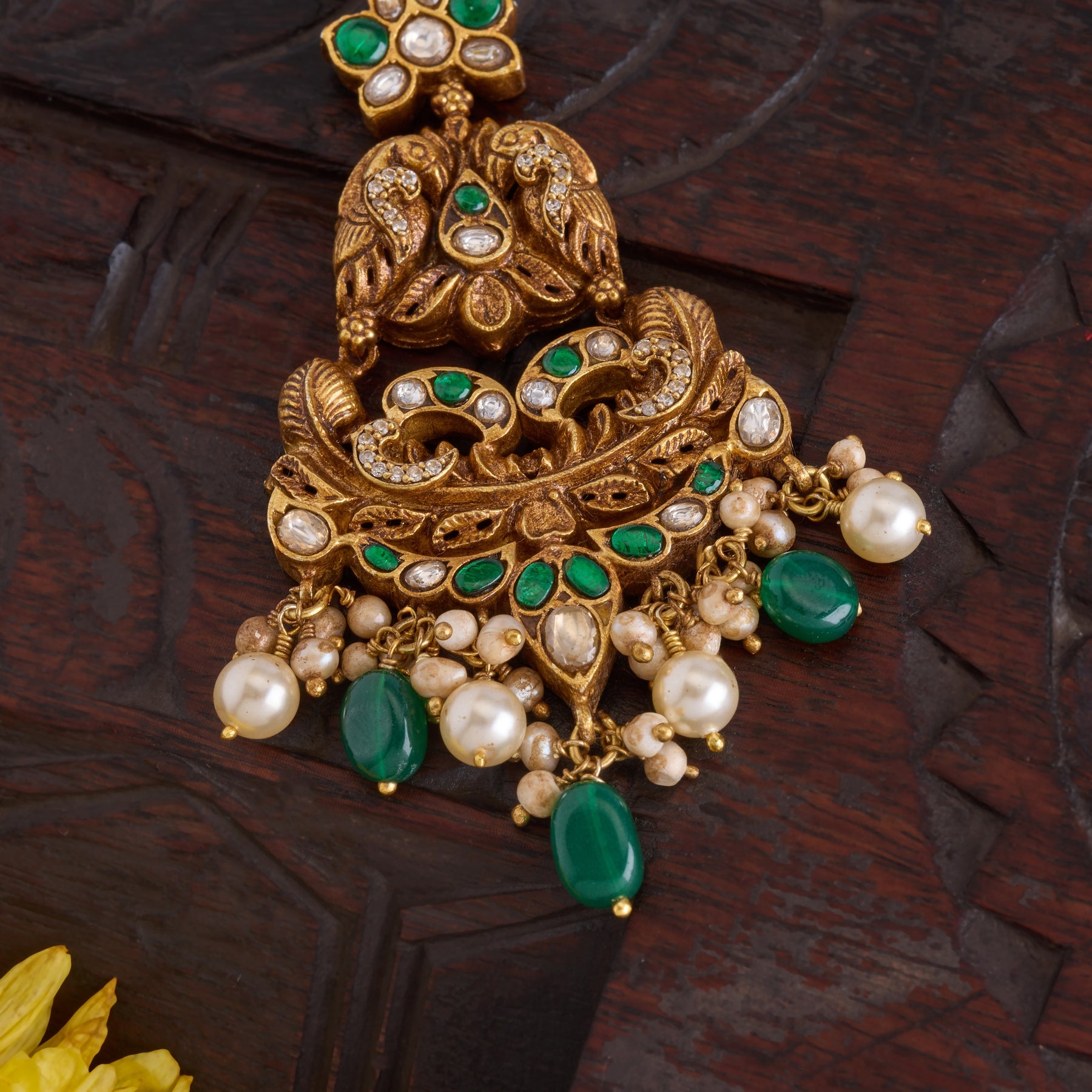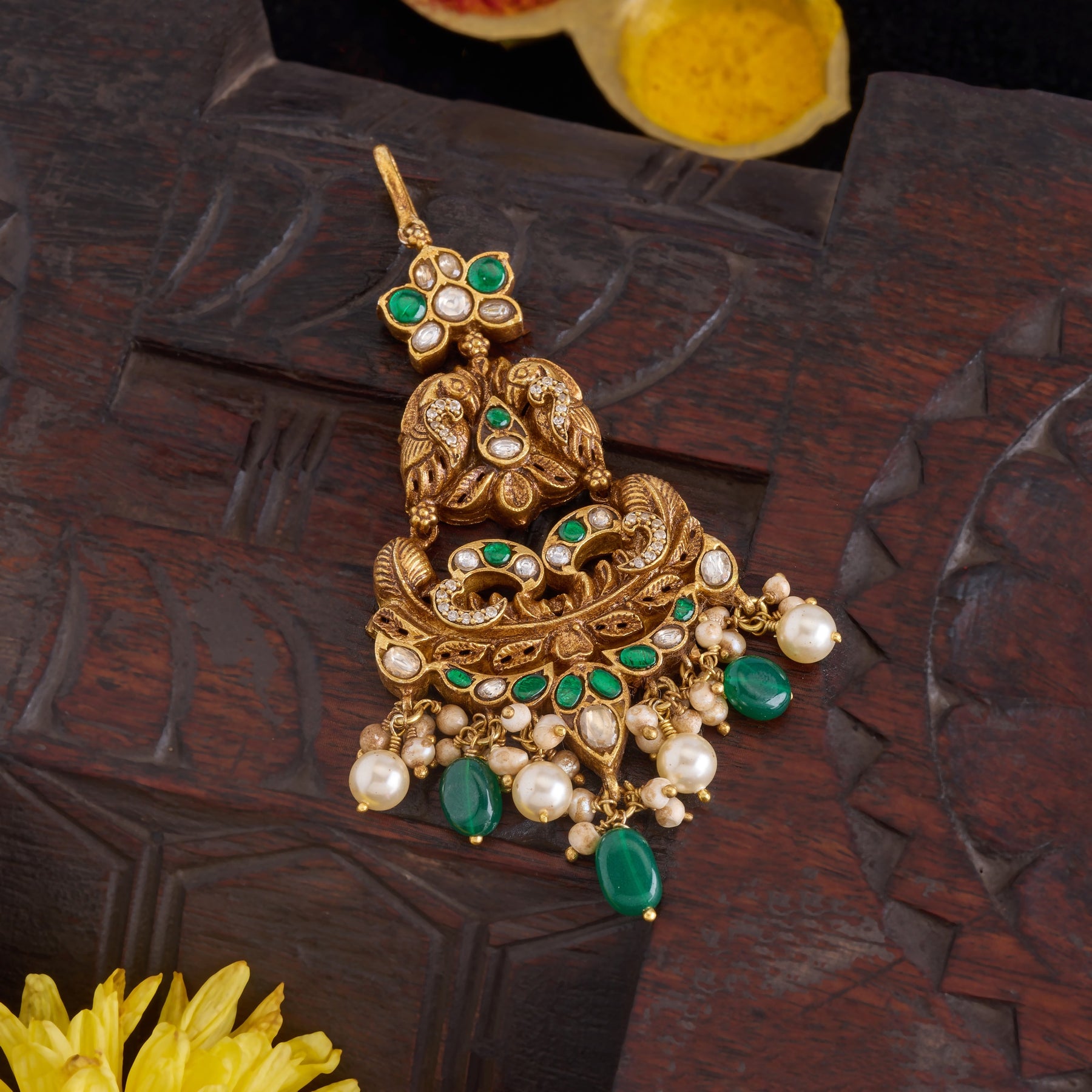 The Mayur Maya Maang Tikka showcases intricate Peacock motifs adorned with brilliant CZ stones set in traditional Kundan craftsmanship. This elegant piece features lustrous Emeralds complemented by delicate Pearl and Emerald hangings that gracefully frame the face. The combination of semi precious gemstones and expert metalwork creates a timeless accessory perfect for weddings, festivals, and special celebrations. Each detail reflects authentic artisanal technique, making this maang tikka a statement piece that honours classical Indian jewellery design while delivering contemporary sophistication.