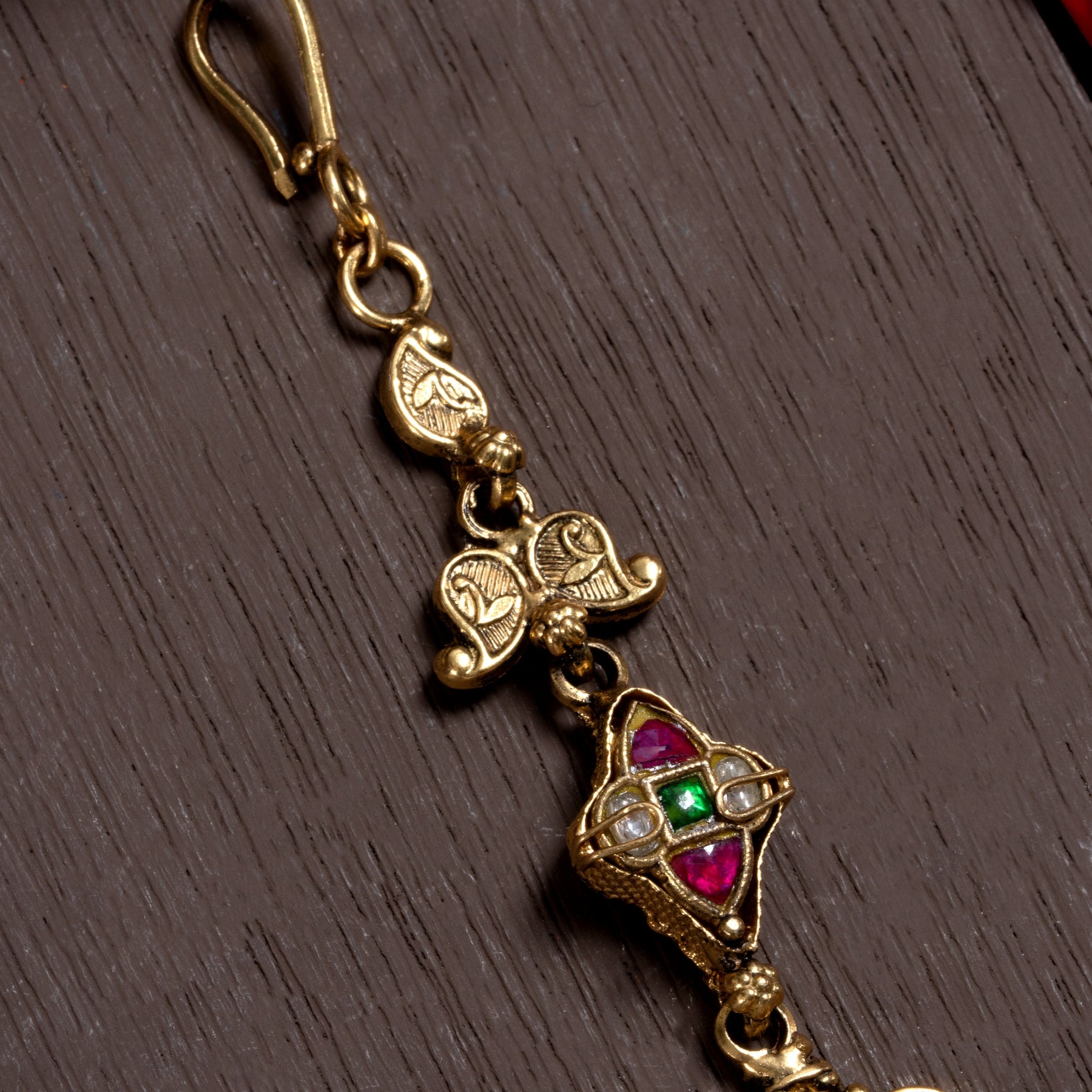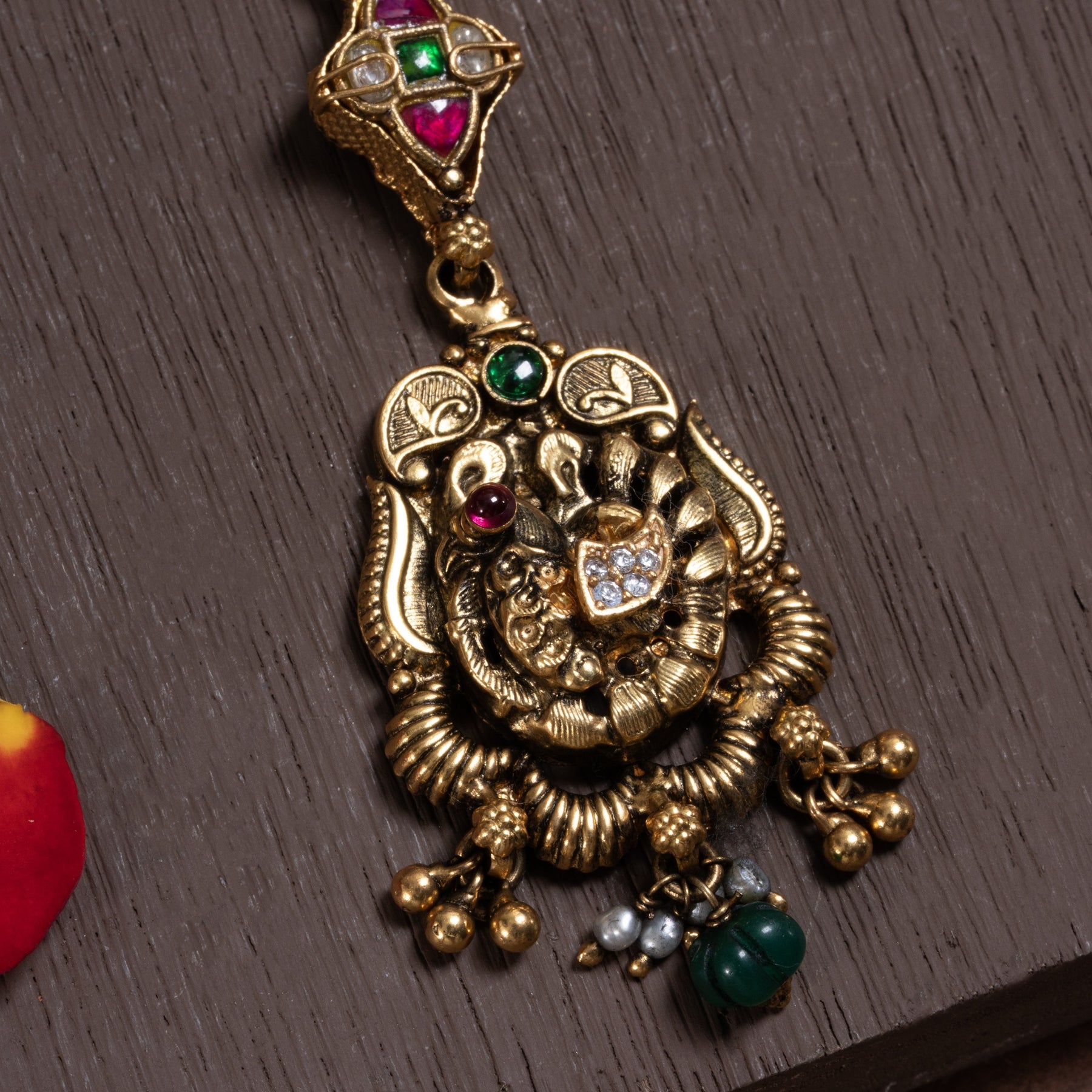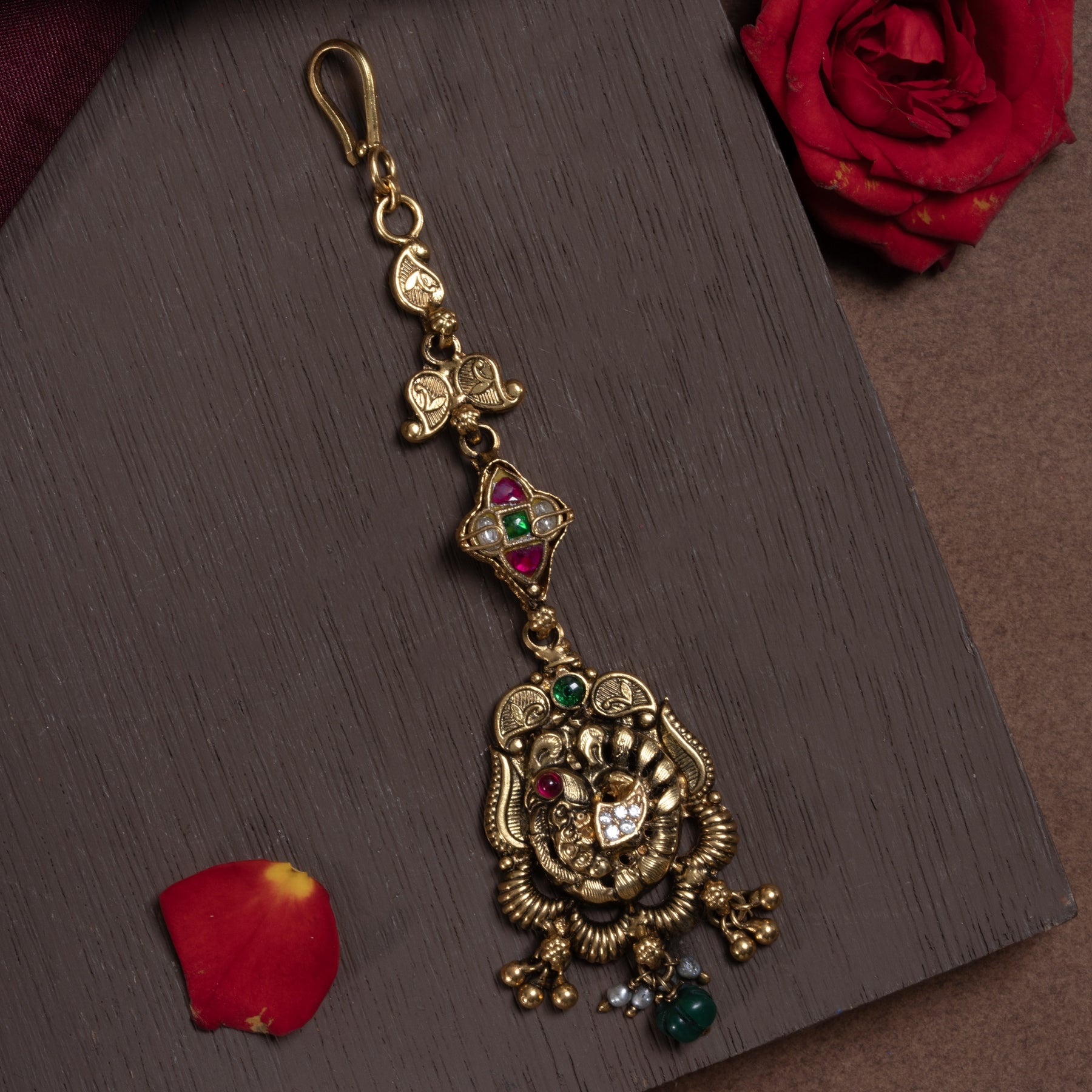 The Morvalli Maang Tikka showcases intricate craftsmanship with a stunning Peacock adorned with brilliant Cubic Zirconia stones. This traditional piece features rich Emerald and Ruby gemstones. The design is elevated Carved Emerald accents with lustrous Pearl and Golden bead drops that cascade gracefully, creating movement and dimension. Each element is thoughtfully positioned to enhance the maang tikka's regal appeal, making it an ideal choice for weddings, festivals, and special celebrations. A timeless accessory that combines traditional artistry with refined elegance.