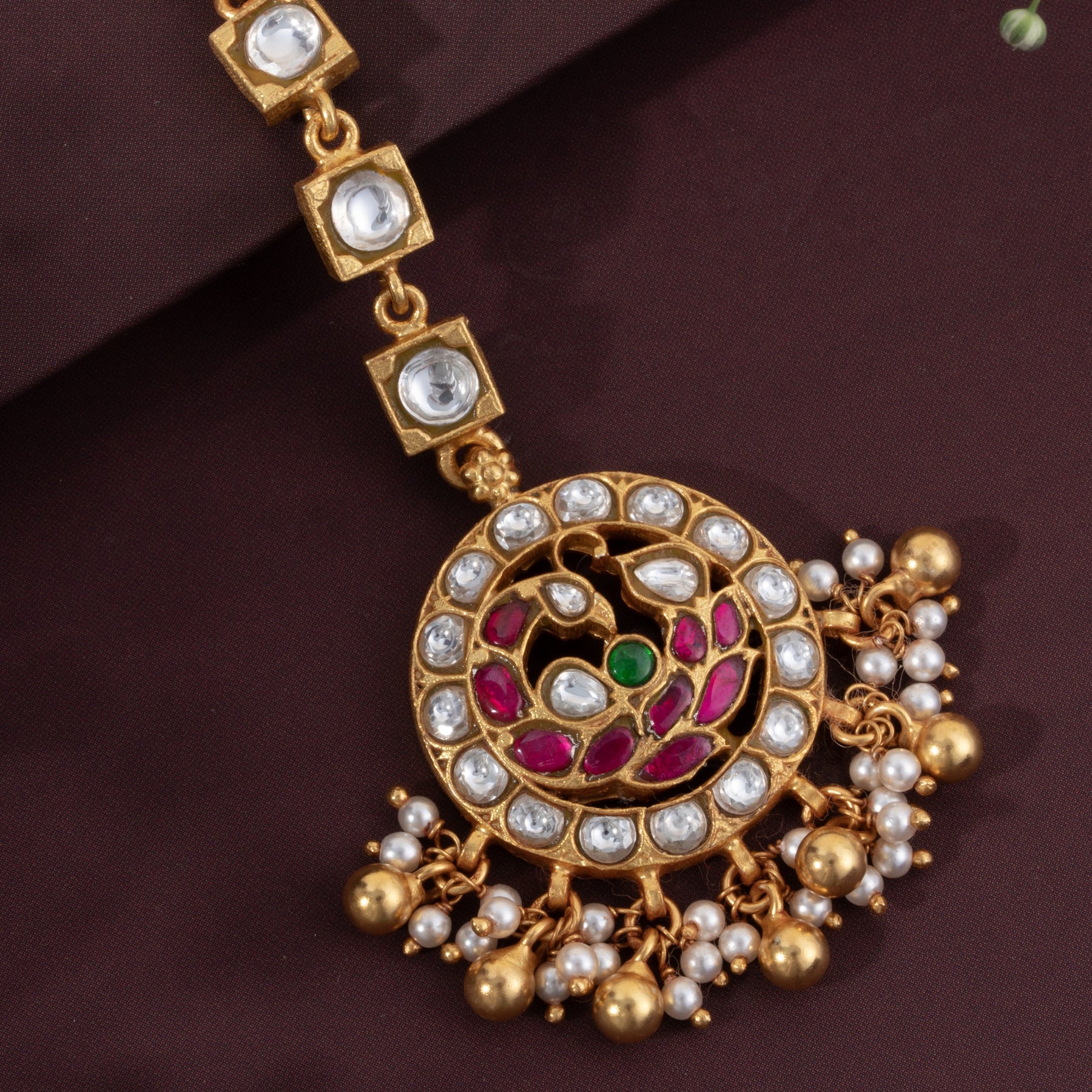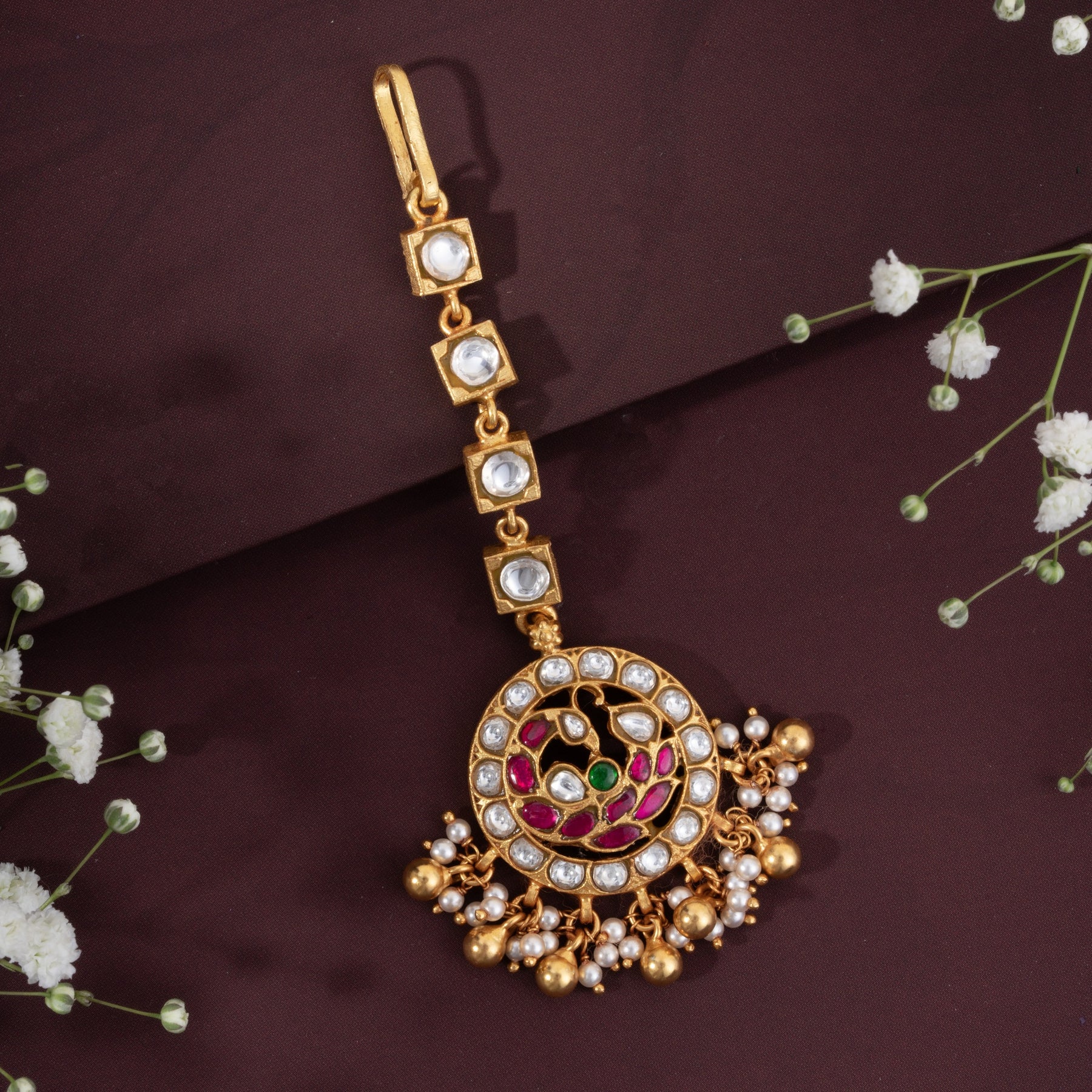 Pavani Mora Maang Tikka showcases exquisite craftsmanship with a stunning Peacock motif adorned with Kundan settings. The design features vibrant Emeralds and rubies complemented by lustrous Pearls and Golden bead hangings that cascade gracefully. This traditional piece combines semi precious gemstones with intricate detailing, creating an elegant accessory perfect for weddings and festive occasions. The Kundan work ensures durability while maintaining the authentic aesthetic of jewellery.