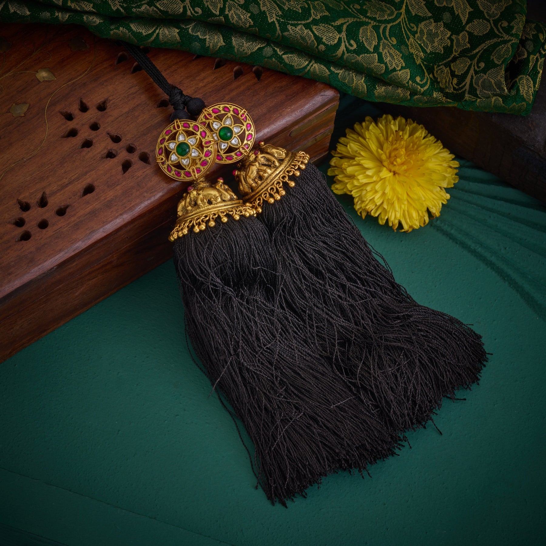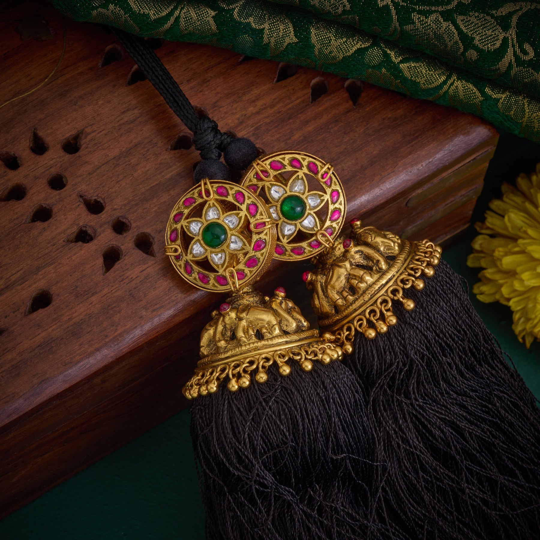 Phool Gaja Kuchu showcases traditional craftsmanship with intricate Floral and Elephant motifs rendered in lustrous detail. Each piece features Kundan-set Rubies and Emeralds that catch light beautifully, complemented by Golden bead drops that add movement and elegance. The black thread accents provide striking contrast, enhancing the overall design's sophistication. This ornament exemplifies heritage jewellery-making, blending semi precious gemstones with artisanal techniques for a statement piece that honour classical aesthetics.