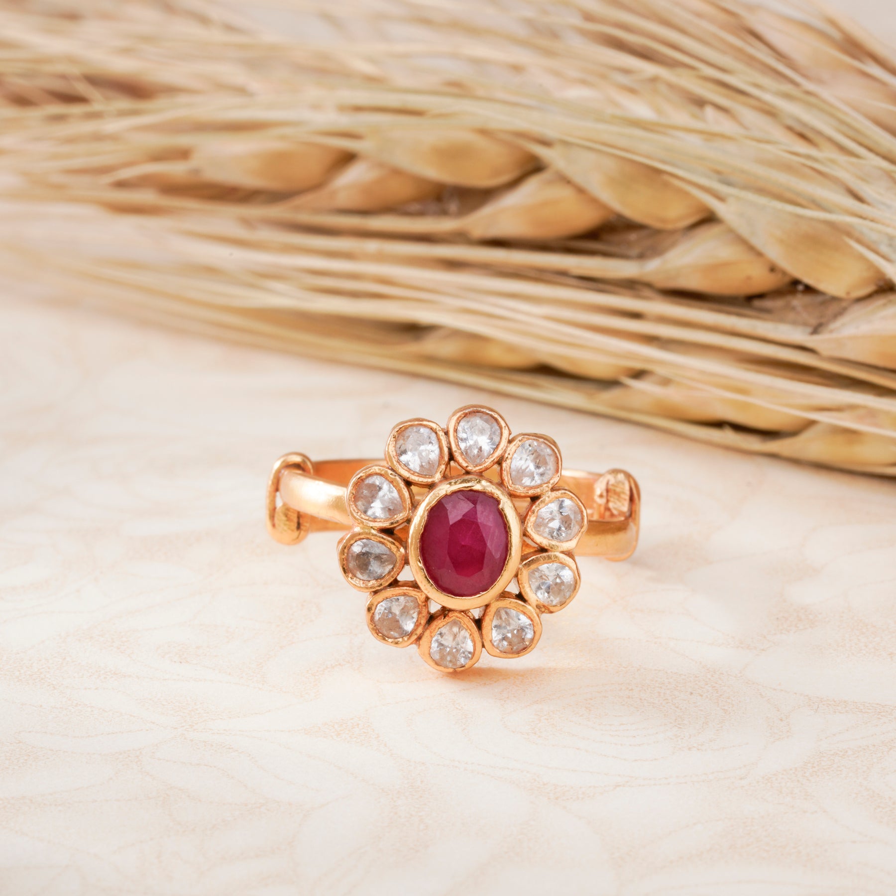 Elevate your everyday elegance with this exquisite Rosive Stone Ring, a masterpiece of refined design. Featuring a captivating Floral silhouette adorned with a striking Red stone centerpiece, complemented by sparkling CZ stones that catch the light beautifully. Each detail is meticulously crafted to create a sophisticated statement piece that seamlessly transitions from day to evening wear. Perfect for those who appreciate timeless beauty with a contemporary edge.