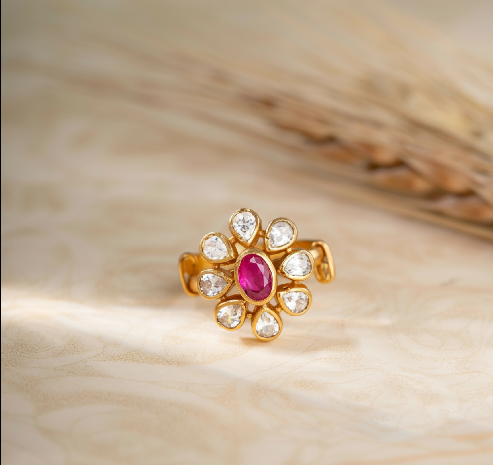 The Smaragda Spark Ring showcases an expert blend of Floral design intricacy, featuring vibrant Emerald stones paired with sparkling Cubic Zirconia accents. This combination highlights refined craftsmanship, offering a sophisticated accessory that enhances elegance and adds a touch of nature-inspired beauty to any ensemble.