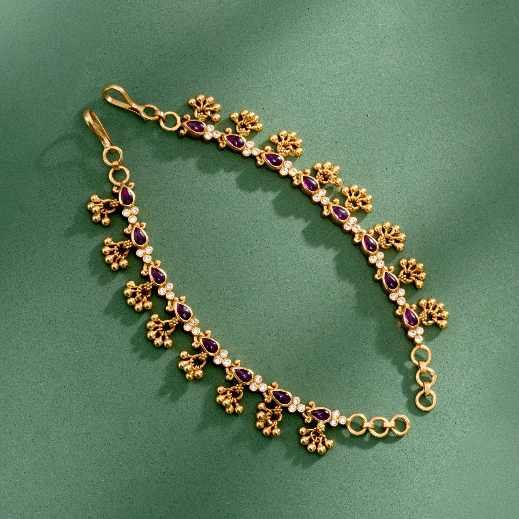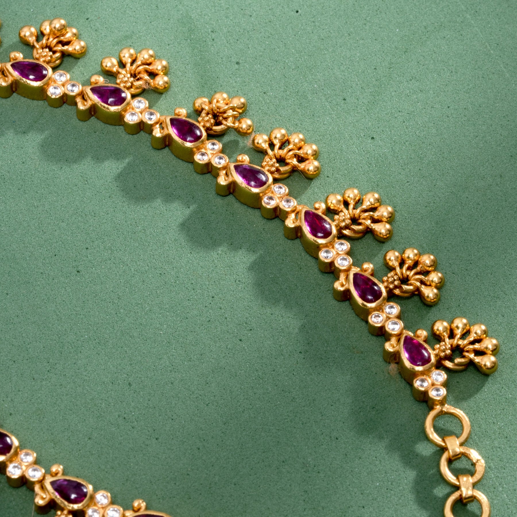 Sumira Matil showcases an elegant design featuring Pearl-shaped elements paired with striking Red stones that command attention. Delicate Golden bead hangings cascade gracefully, adding movement and sophistication to the piece. The expert craftsmanship combines traditional aesthetics with refined detailing, creating a versatile accessory suitable for both everyday wear and special occasions. Perfect for those who appreciate jewellery that balances bold colour with understated elegance.