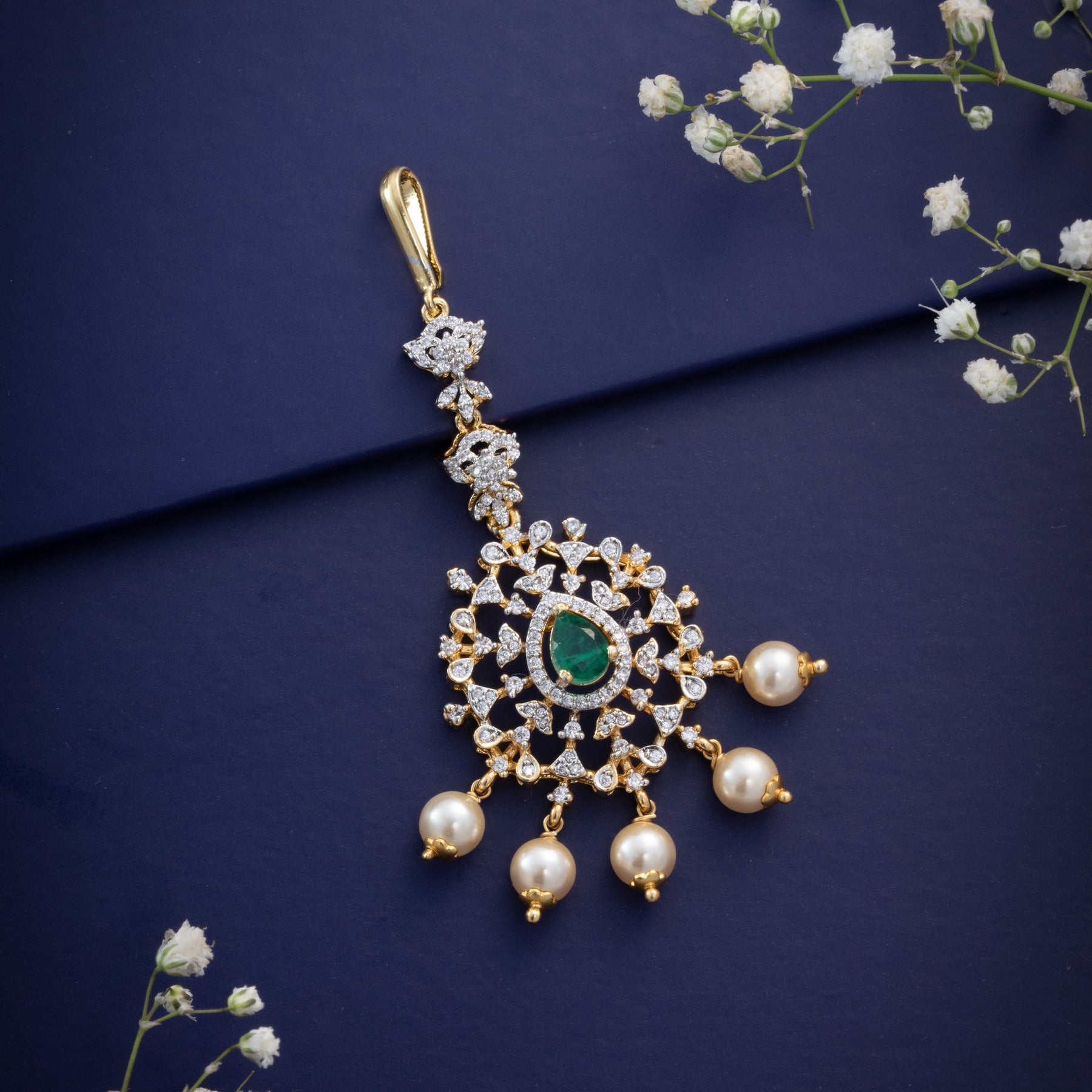 The Zavira Crown Maang Tikka combines timeless elegance with contemporary design. This exquisite piece features a stunning Pear-shaped emerald as its centrepiece, complemented by intricate Floral detailing that adds sophistication and movement. Sparkling Cubic Zirconia stones enhance the brilliance throughout the design, while delicate Pearl drops cascade gracefully, creating a refined finishing touch. Perfect for weddings, festivals, and special occasions, this maang tikka brings together traditional craftsmanship with modern aesthetics, making it an essential addition to any jewellery collection.