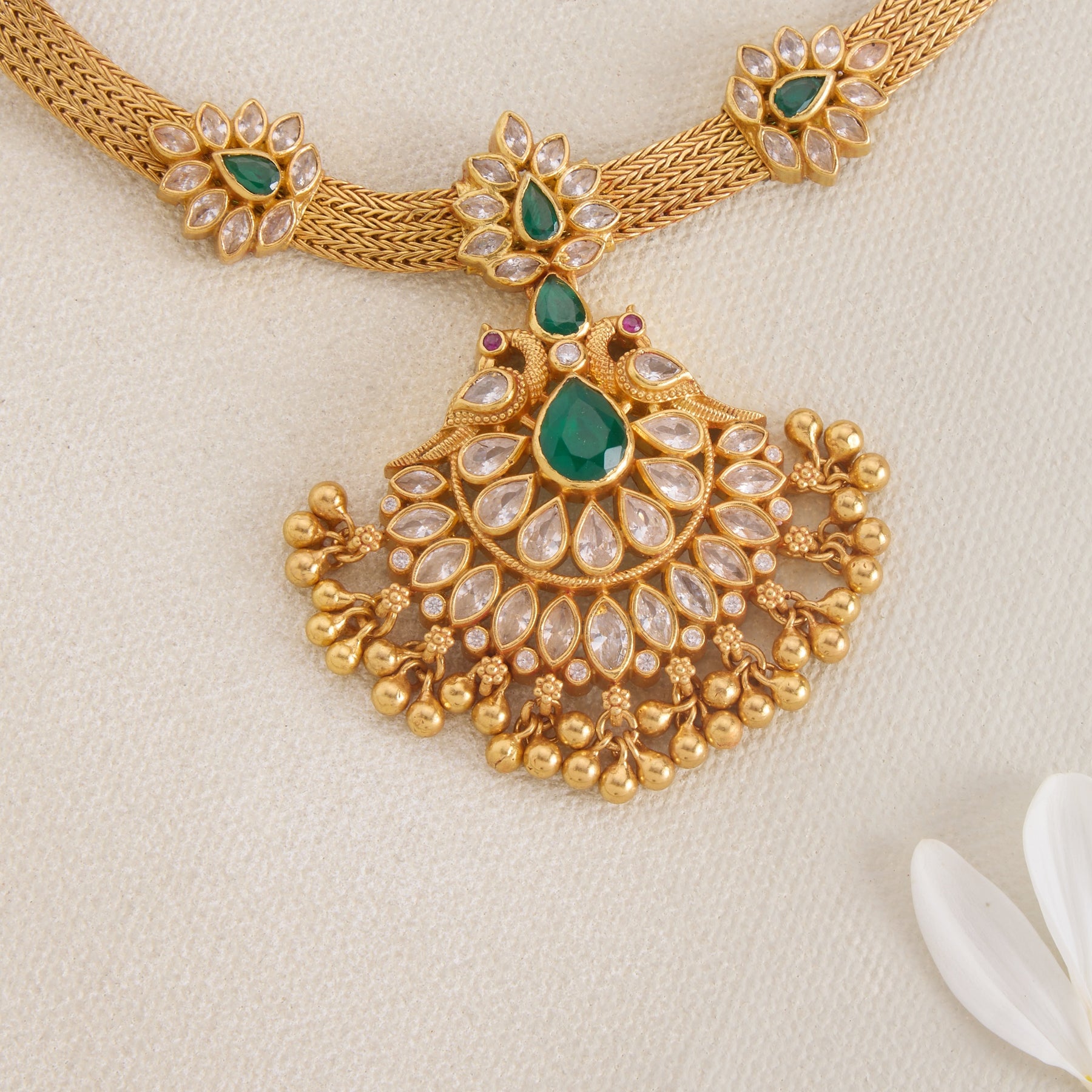 Crafted with precision, the Aarika Stone Short Necklace features a stunning Pear-shaped emerald stone set in an elegant CZ stones setting. This exquisite piece combines traditional craftsmanship with timeless beauty, making it a perfect accessory to enhance any outfit with a rich, sophisticated touch.