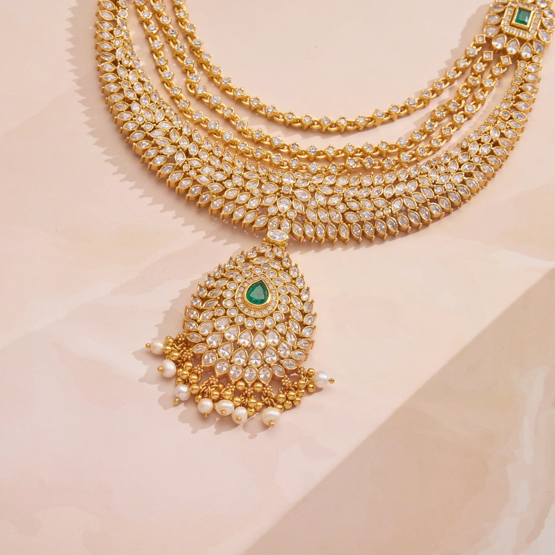 Devaani Three Layer Necklace is a beautifully crafted piece, featuring a stunning design of Florals adorned with sparkling CZ stones, Rubies, and Emeralds. The addition of Pearl beads adds a touch of elegance to this necklace. Elevate any look with this unique piece.