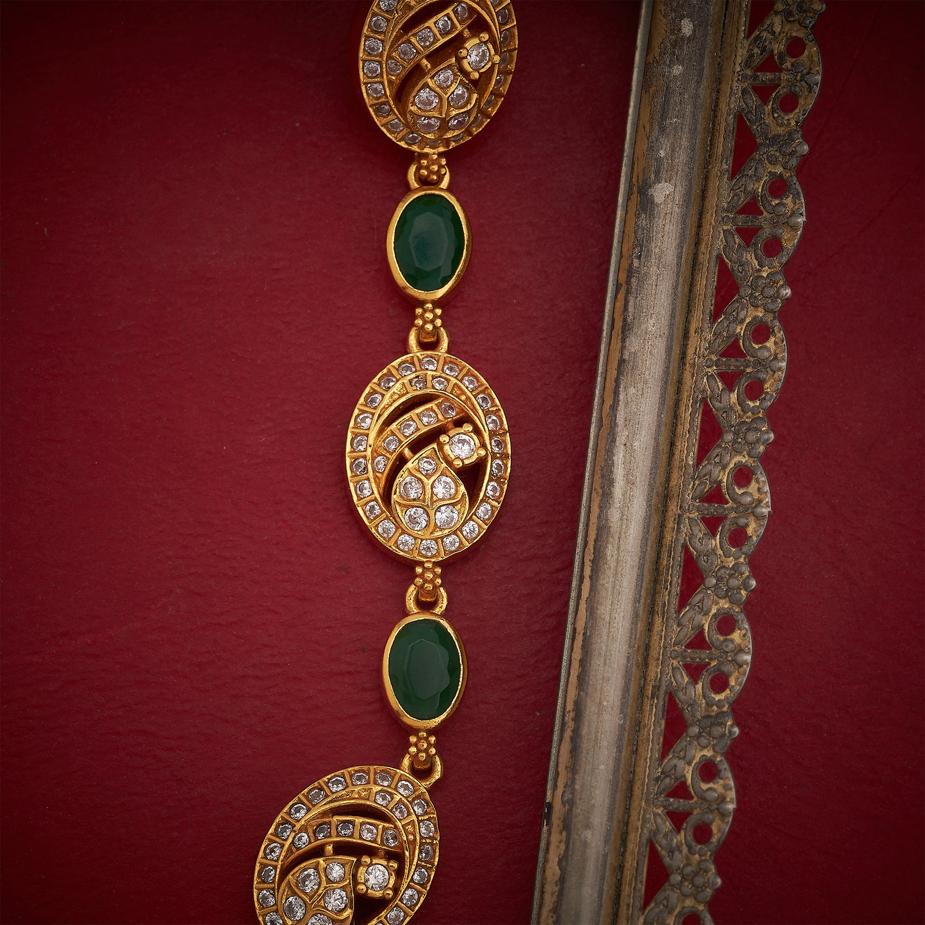 Presenting the Rudra Ray Short Necklace. This beautiful necklace features a unique Oval centre with alternating designer motifs and sparkling Emeralds. The centre Oval also boasts a small Ruby and accents of CZ stones all over. This elegant piece is perfect for adding a touch of sophistication and glamour to any outfit.