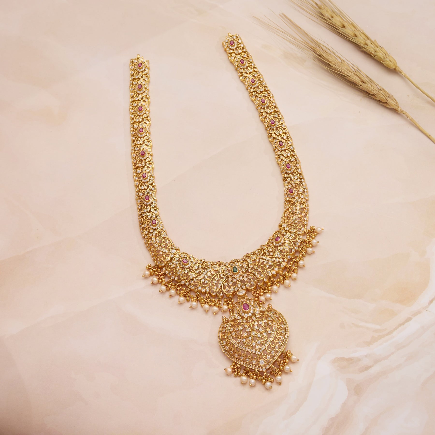 Saanra Pear Haaram is a beautifully crafted piece, featuring a stunning design of Peacock and Florals adorned with sparkling CZ stones, Rubies, and Emeralds. The addition of Pearl beads adds a touch of elegance to this necklace. Elevate any look with this unique piece.