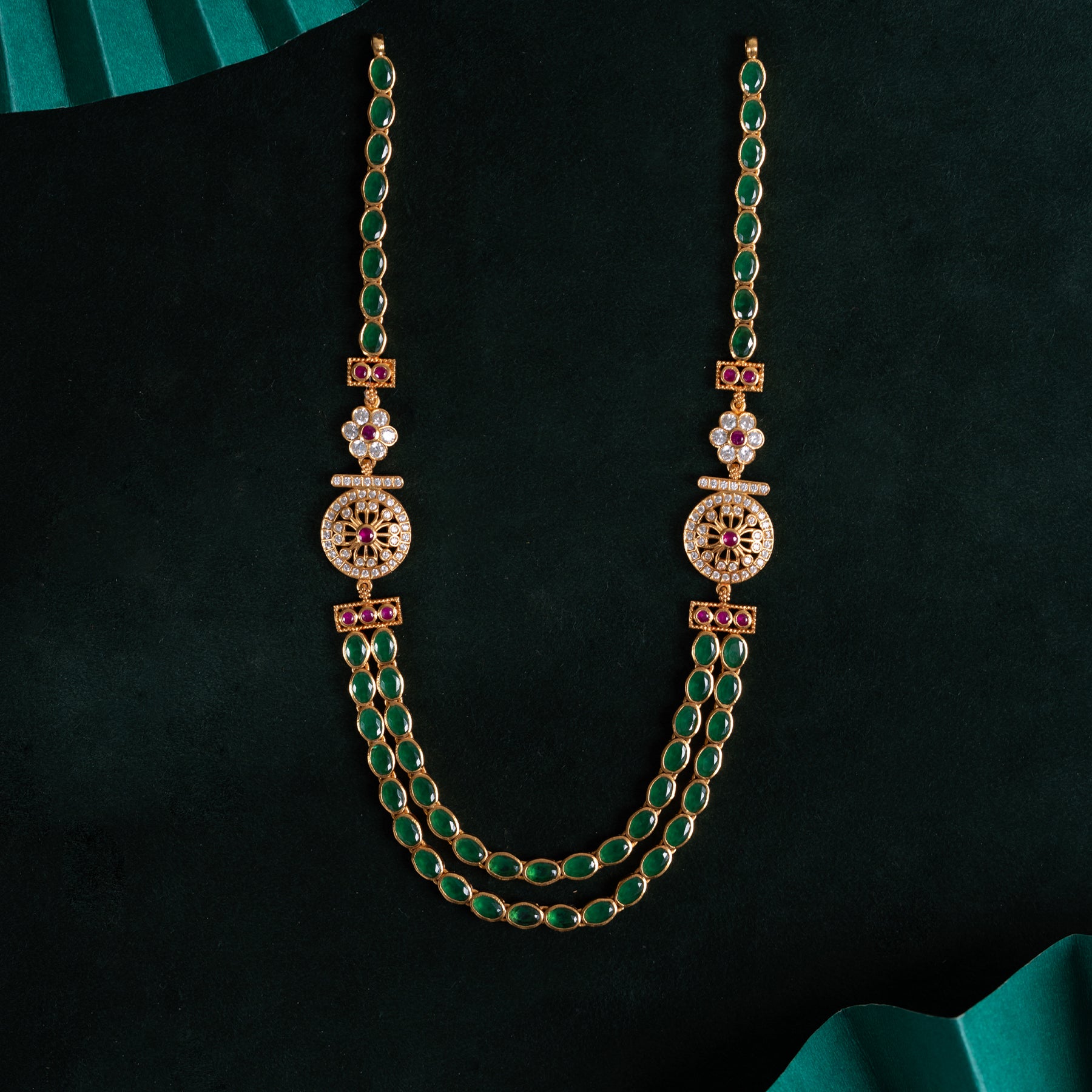 The Twin Trails Necklace showcases an expert blend of Floral design intricacy, enhanced by the vibrant sparkle of Emeralds and the brilliance of Cubic Zirconia stones. This piece offers a refined elegance, perfect for those seeking a sophisticated accessory that highlights craftsmanship and timeless beauty.