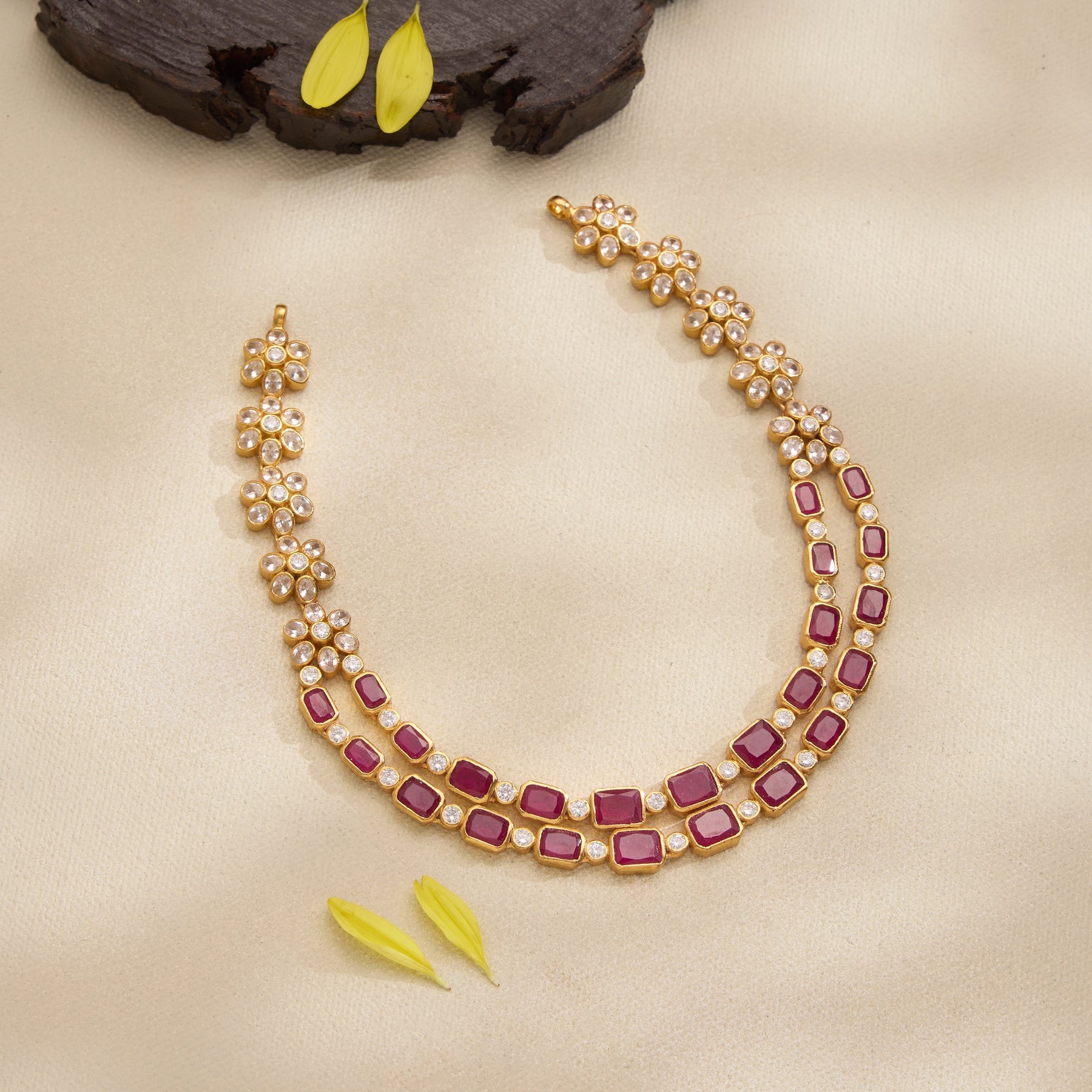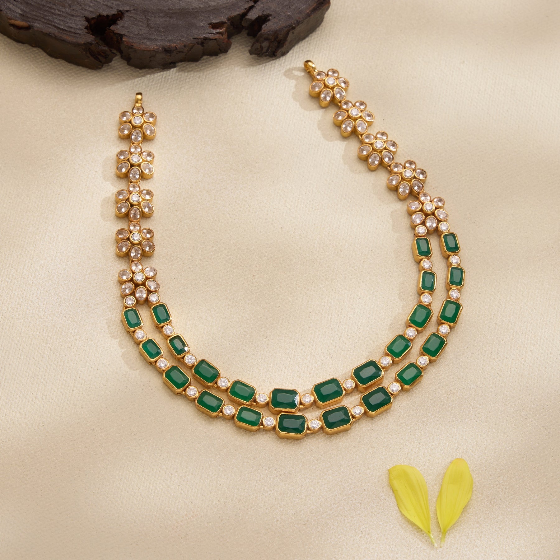 The Eshna Twin Necklace highlights masterful craftsmanship with its intricate Floral design, elevated by the rich green shimmer of Emeralds. Accented with dazzling Cubic Zirconia stones, this piece artfully balances sophistication and brilliance, making it a refined choice for those seeking elegance and detailed artistry.