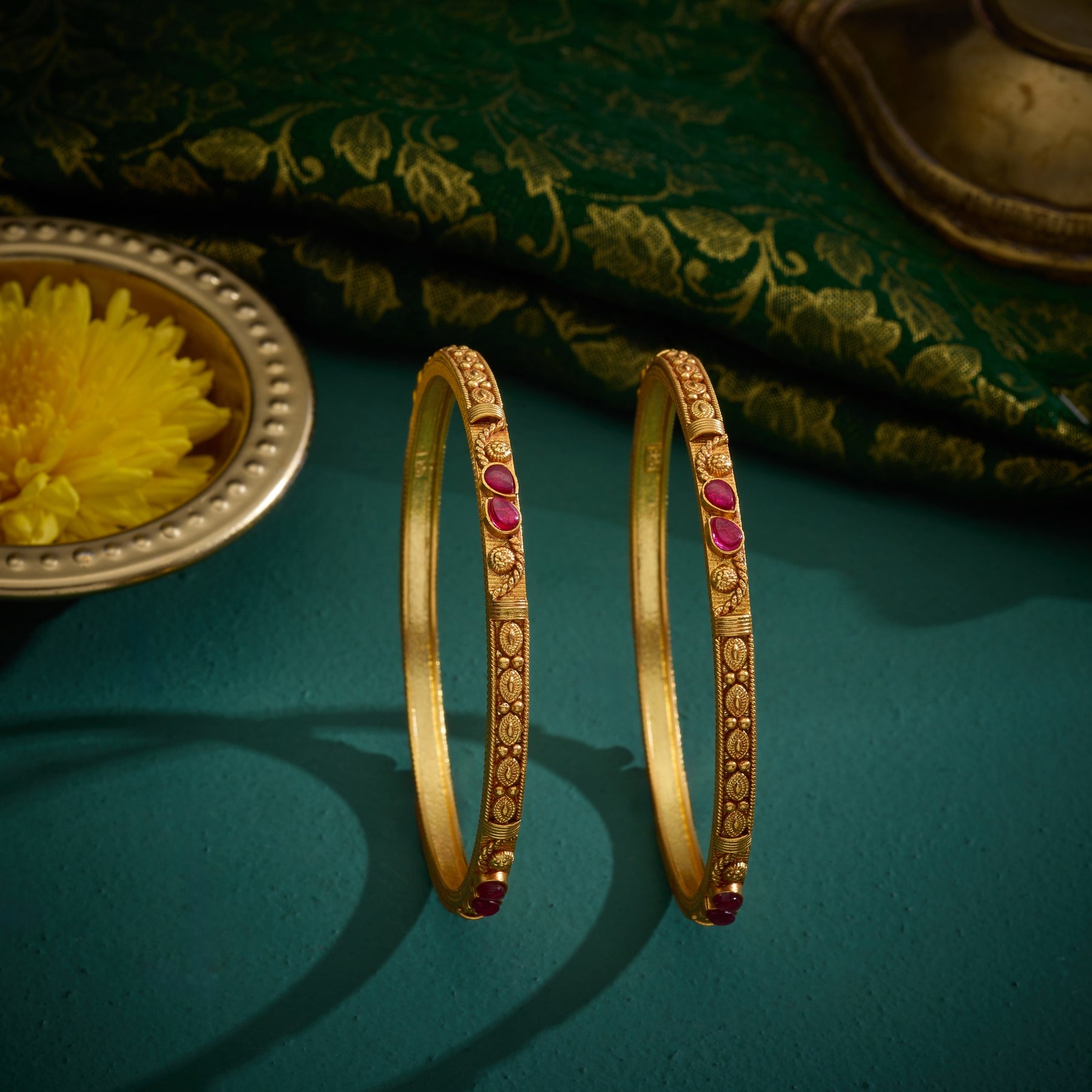Elevate your collection with these exquisite Pear Ruvina Bangles, meticulously crafted to showcase the timeless allure of Pear-shaped rubies. Each bangle features a carefully selected ruby cut in the distinctive Pear silhouette, known for its ability to elongate the wrist while maximizing the stone's natural brilliance. The expert craftsmanship ensures secure settings that protect your semi precious gemstones while allowing their deep crimson hues to command attention. Perfect for both ceremonial occasions and refined everyday wear, these bangles represent the pinnacle of traditional jewellery artistry combined with contemporary design sensibilities.