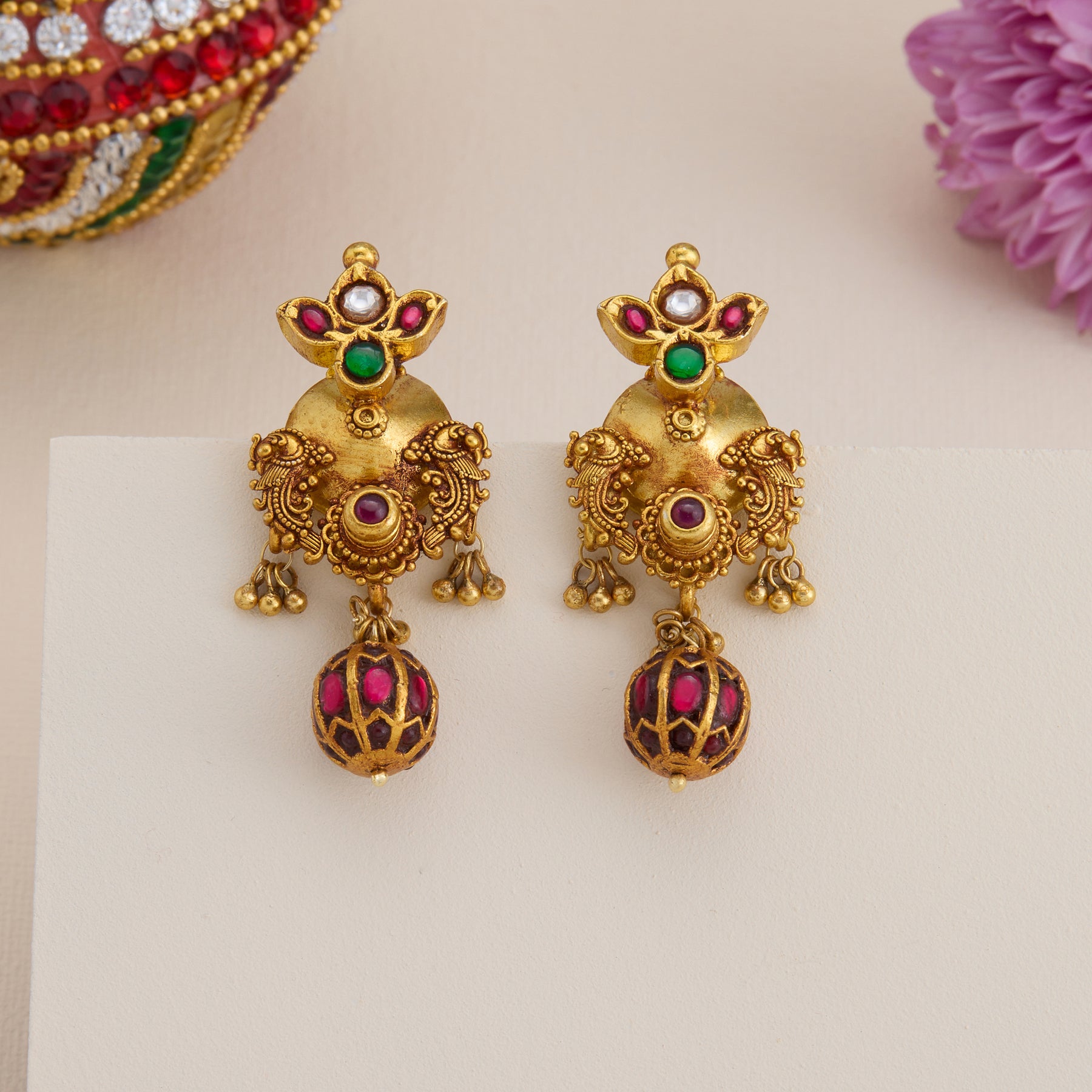 Elevate your style with the Ruby Plumage Danglers, expertly crafted to showcase a stunning Peacock. Adorned with vibrant Rubies and rich Emeralds, these earrings capture the bird’s majestic elegance and vivid colours. Each piece reflects skilled artistry, making them a striking accessory for special occasions or refined everyday wear. The combination of precious stones not only enhances the visual appeal but also offers timeless sophistication. Perfect for those who appreciate intricate design and luxurious detail.