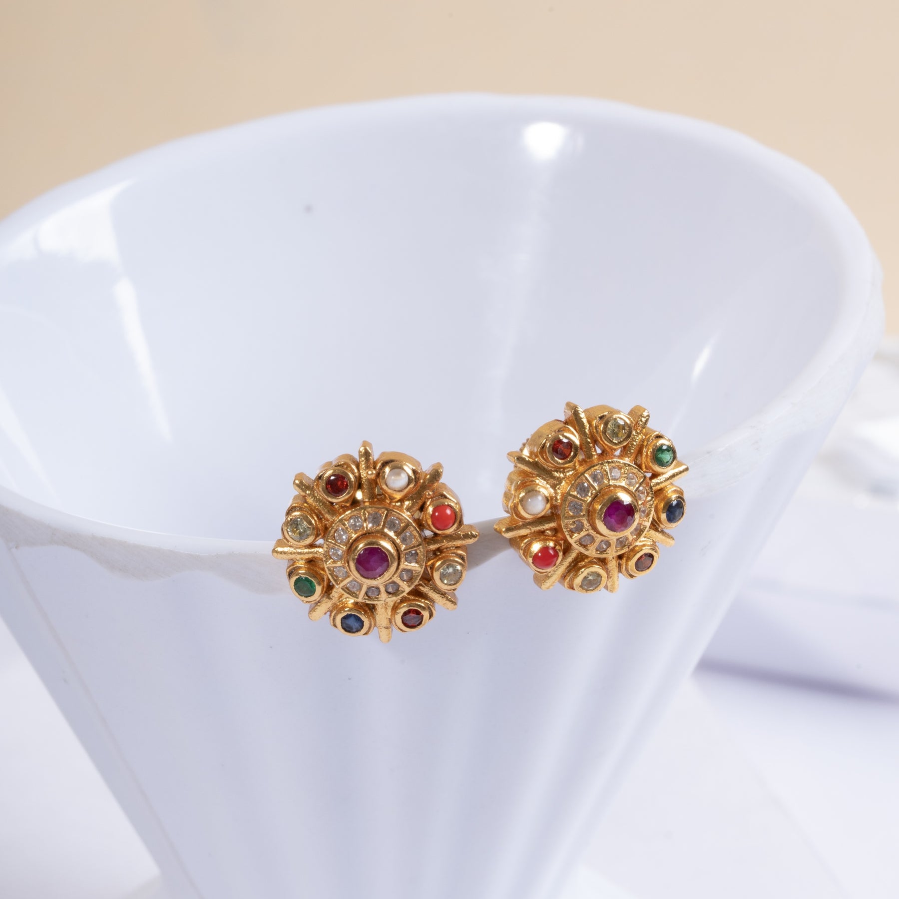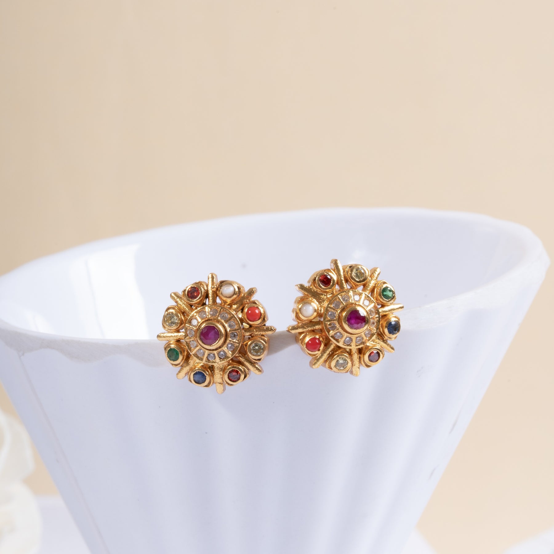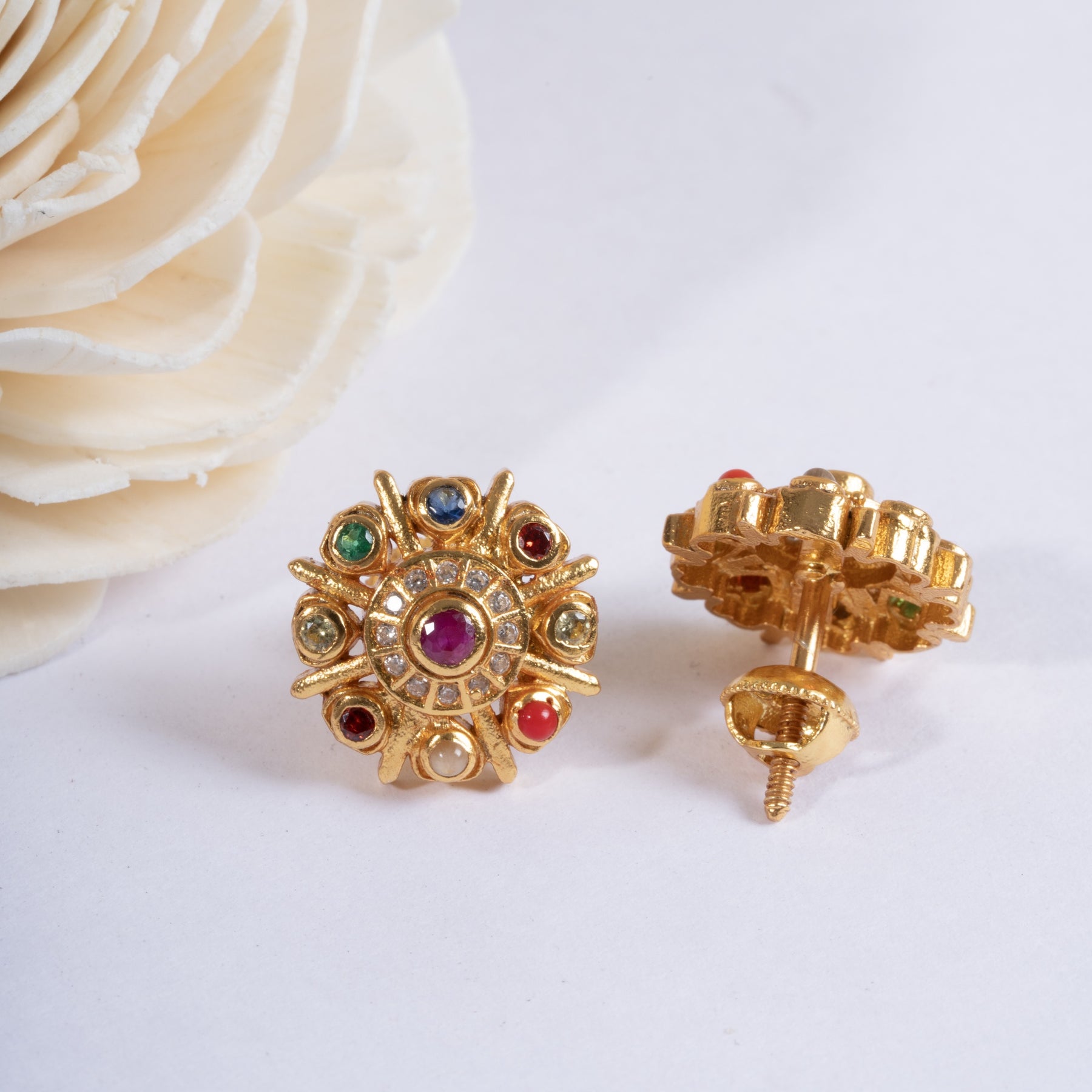 Heritage Studs showcasing super Navaratna gemstone design studs with Floral pattern. Adorned with vibrant 9 stones of magic, these earrings combine traditional craftsmanship with a refined elegance, making them perfect for festive occasions. Their detailed design highlights cultural heritage while adding a subtle yet striking pop of colour to your ensemble.