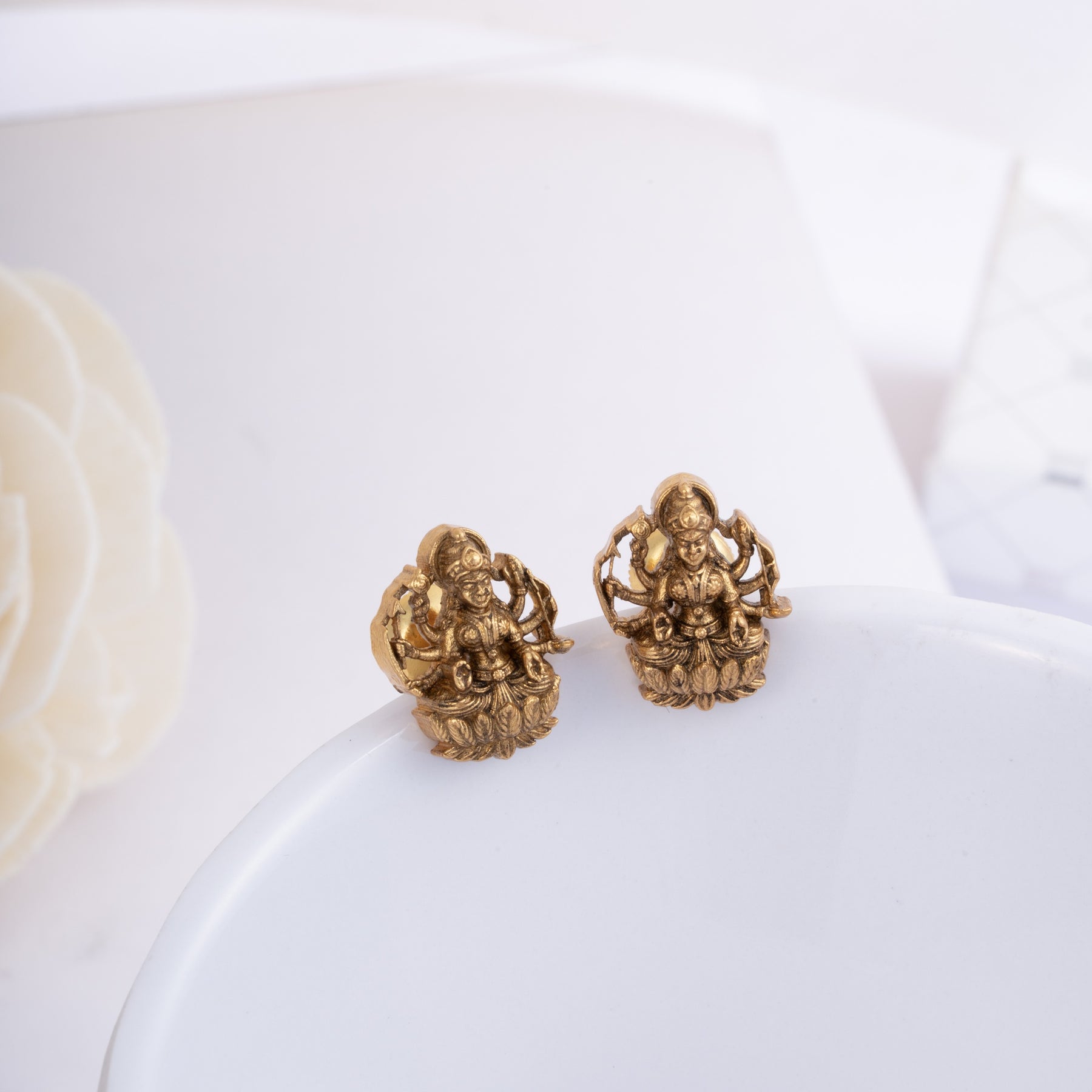 The Vimalakshmi Studs showcase intricate Lakshmi motifs, symbolizing prosperity and grace. These earrings combine traditional craftsmanship with a refined elegance, making them perfect for festive occasions. Their detailed design highlights cultural heritage while adding a subtle yet striking pop of colour to your ensemble.