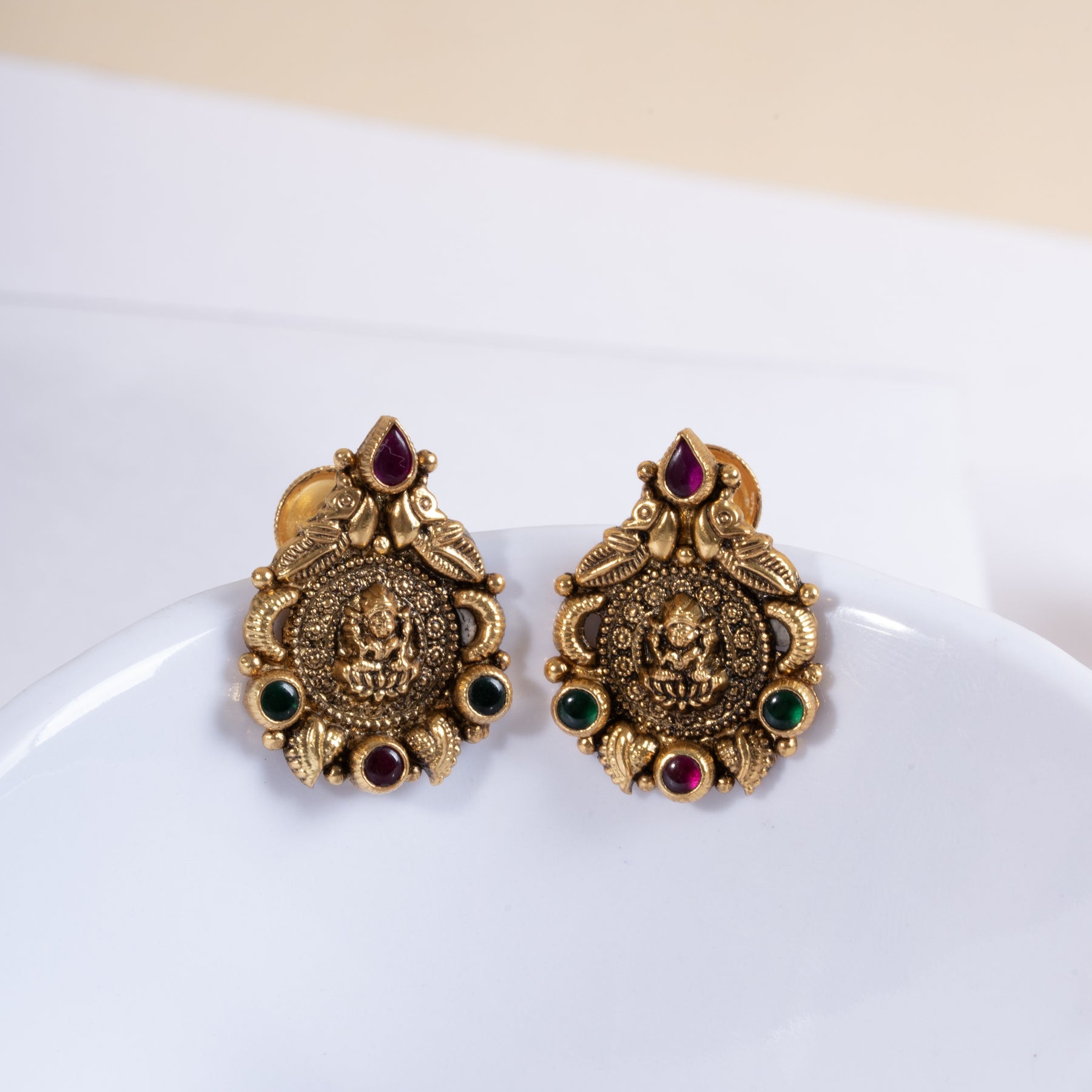 Vintage Bliss Studs showcase intricate Lakshmi motifs, symbolizing prosperity and grace. These earrings combine traditional craftsmanship with a refined elegance with graceful rubies and emeralds, making them perfect for festive occasions. Their detailed design highlights cultural heritage while adding a subtle yet striking pop of colour to your ensemble.