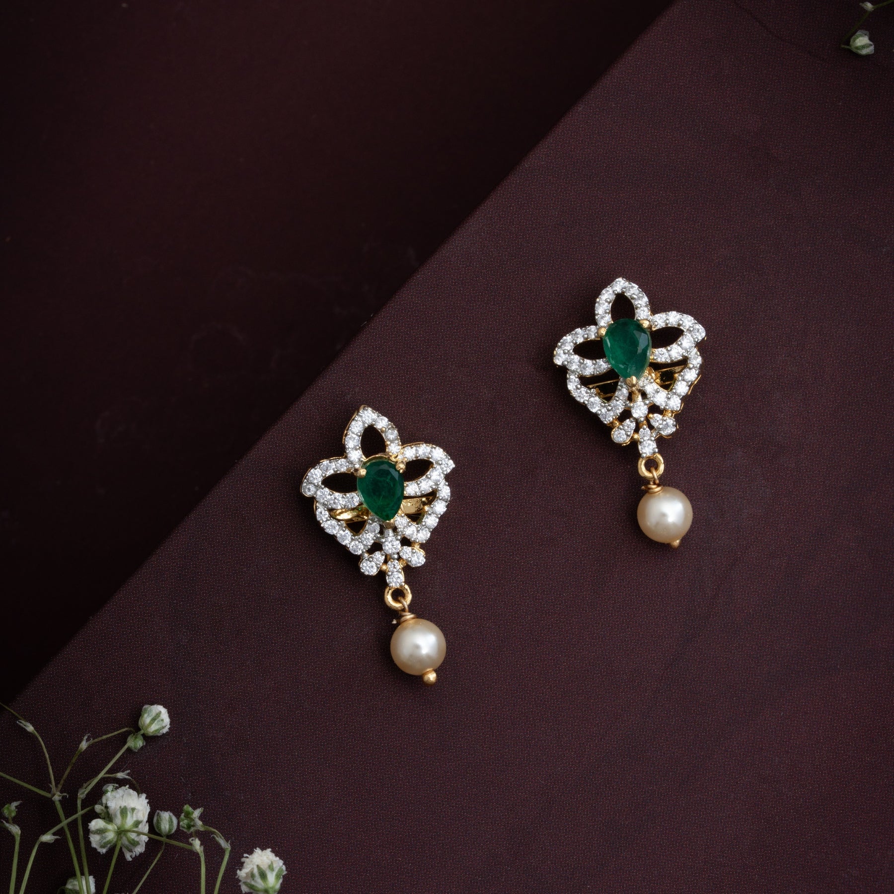 Pearé Noor Studs showcase a sophisticated Pear-shaped Emerald centrepiece, elegantly framed by sparkling Cubic Zirconia stones that amplify its luminous appeal. A delicate Pearl drop suspended beneath adds refined movement and dimension to these statement earrings. The expert craftsmanship combines semi-precious elements to create a versatile piece that transitions seamlessly for special occasions. Perfect for those who appreciate timeless design with contemporary flair.