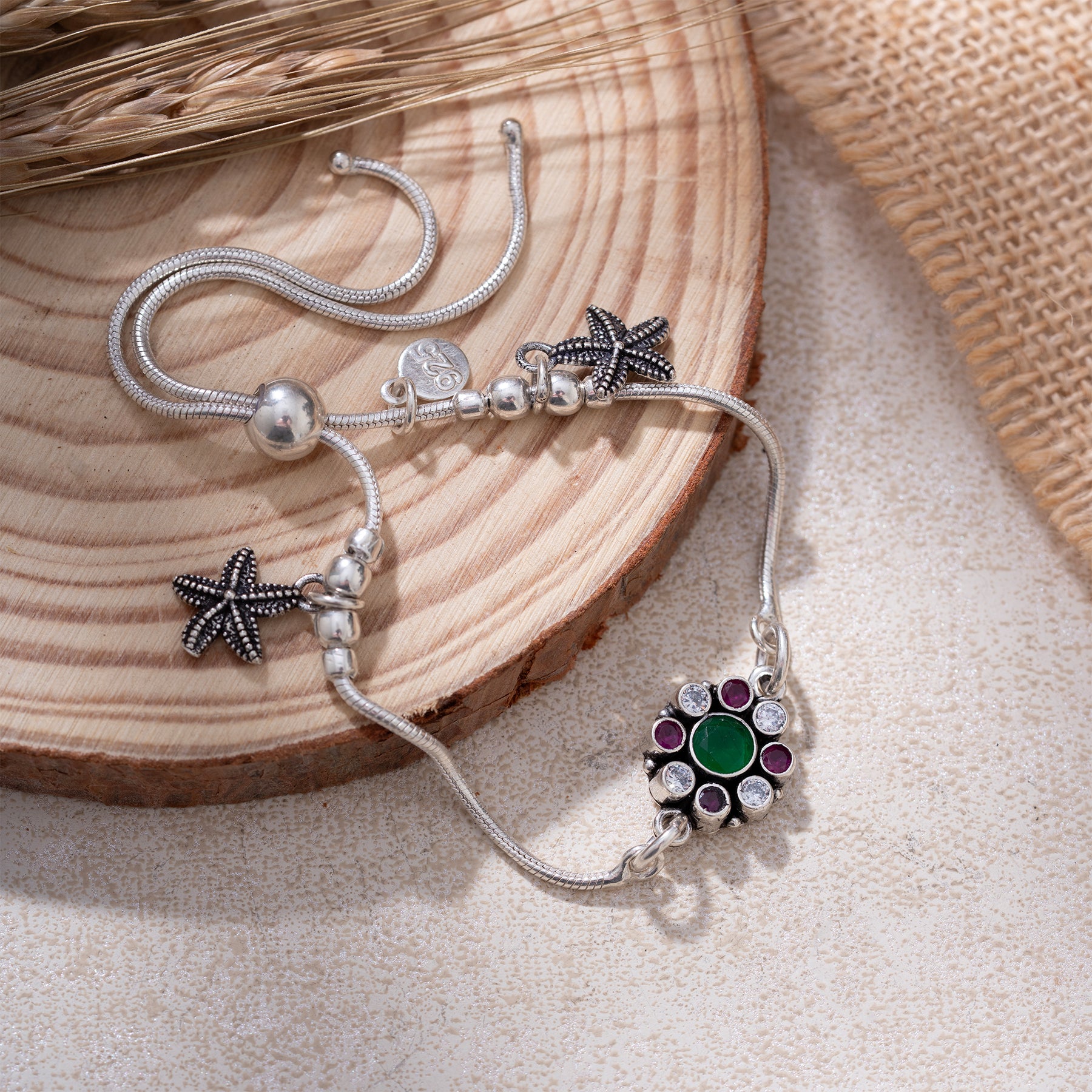 The Sagarika Bracelet showcases intricate Floral Motifs adorned with sparkling CZ stones, complemented by vibrant Emeralds and Rubies. Accented with delicate Silver Beads, this piece combines craftsmanship with elegant design, making it a refined choice for adding a touch of sophistication to any ensemble.