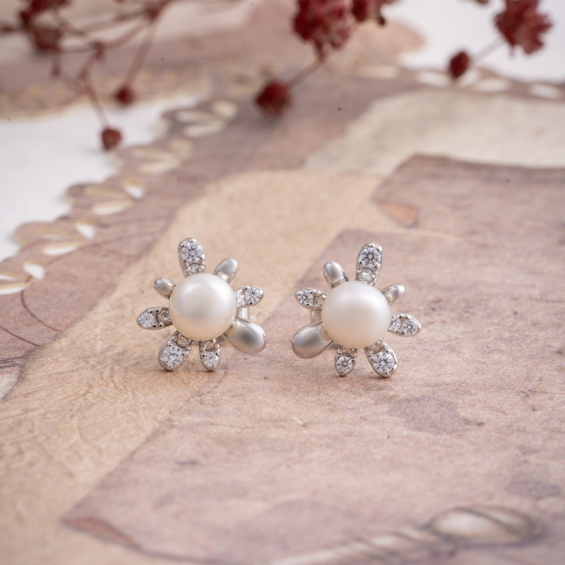 Daisy Glow Studs capture timeless elegance with their delicate Floral silhouette adorned with sparkling Cubic Zirconia stones and lustrous Pearls. Each stud features meticulous craftsmanship, blending nature-inspired design with refined sophistication. The interplay of brilliant CZ accents and soft Pearl luminescence creates an understated yet striking aesthetic, perfect for elevating both everyday wear and special occasions. A versatile addition to any jewellery collection.