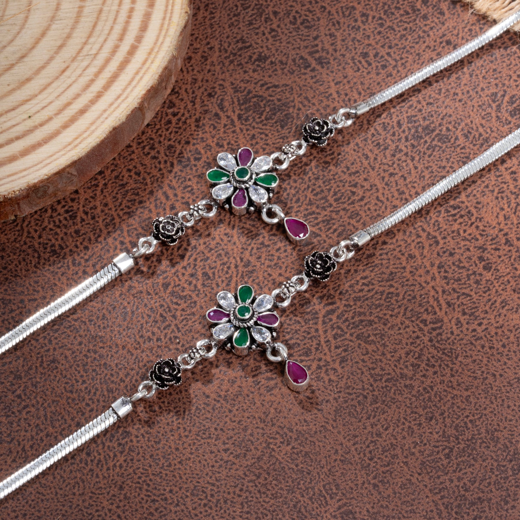 Yuvira Rose Payal showcases intricate Floral Motifs adorned with brilliant CZ stones, complemented by rich Emerald accents and a striking Pear-shaped Ruby drop. This traditional ankle ornament combines timeless design with sophisticated gemstone work, featuring carefully selected stones that catch light beautifully. Perfect for festive occasions and special celebrations, the piece balances ornamental elegance with refined craftsmanship, making it an essential addition to your traditional jewellery collection.