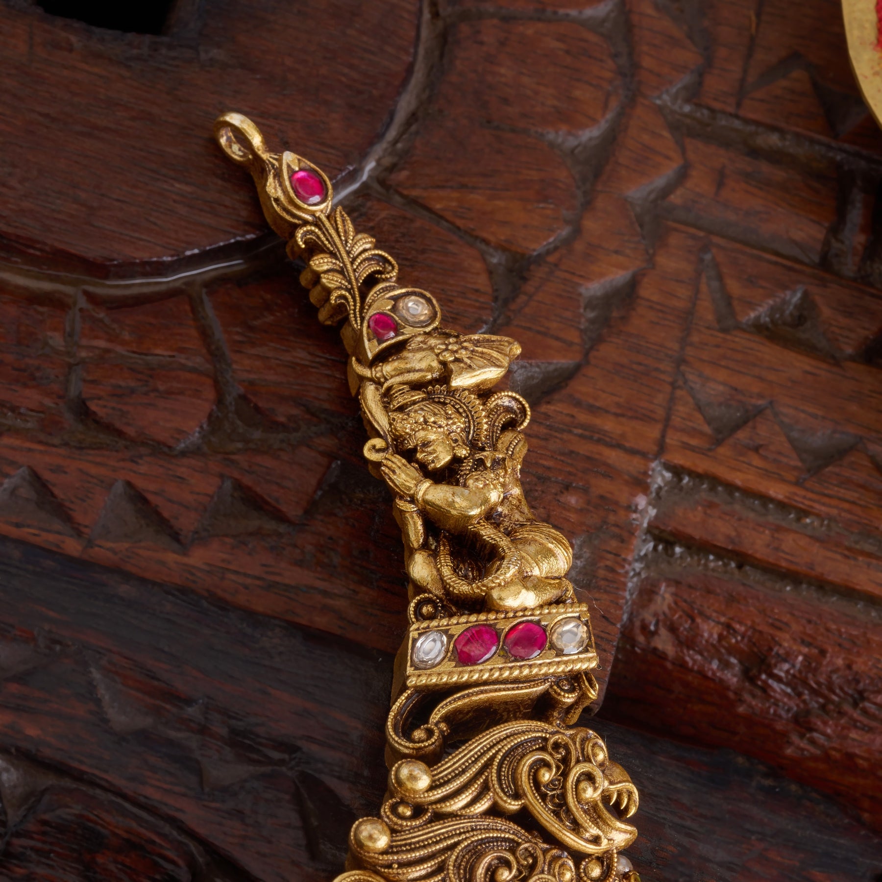 The Devi Aarambhika Necklace showcases exquisite craftsmanship with sacred Lakshmi, Peacock, and Devata motifs rendered in Kundan setting. This heirloom piece features lustrous Pearls, vibrant rubies, and intricately carved Emeralds that capture light with refined elegance. Each element is thoughtfully positioned to honour traditional artistry while delivering contemporary sophistication. Perfect for celebrations and special occasions, this necklace embodies spiritual grace and timeless beauty.