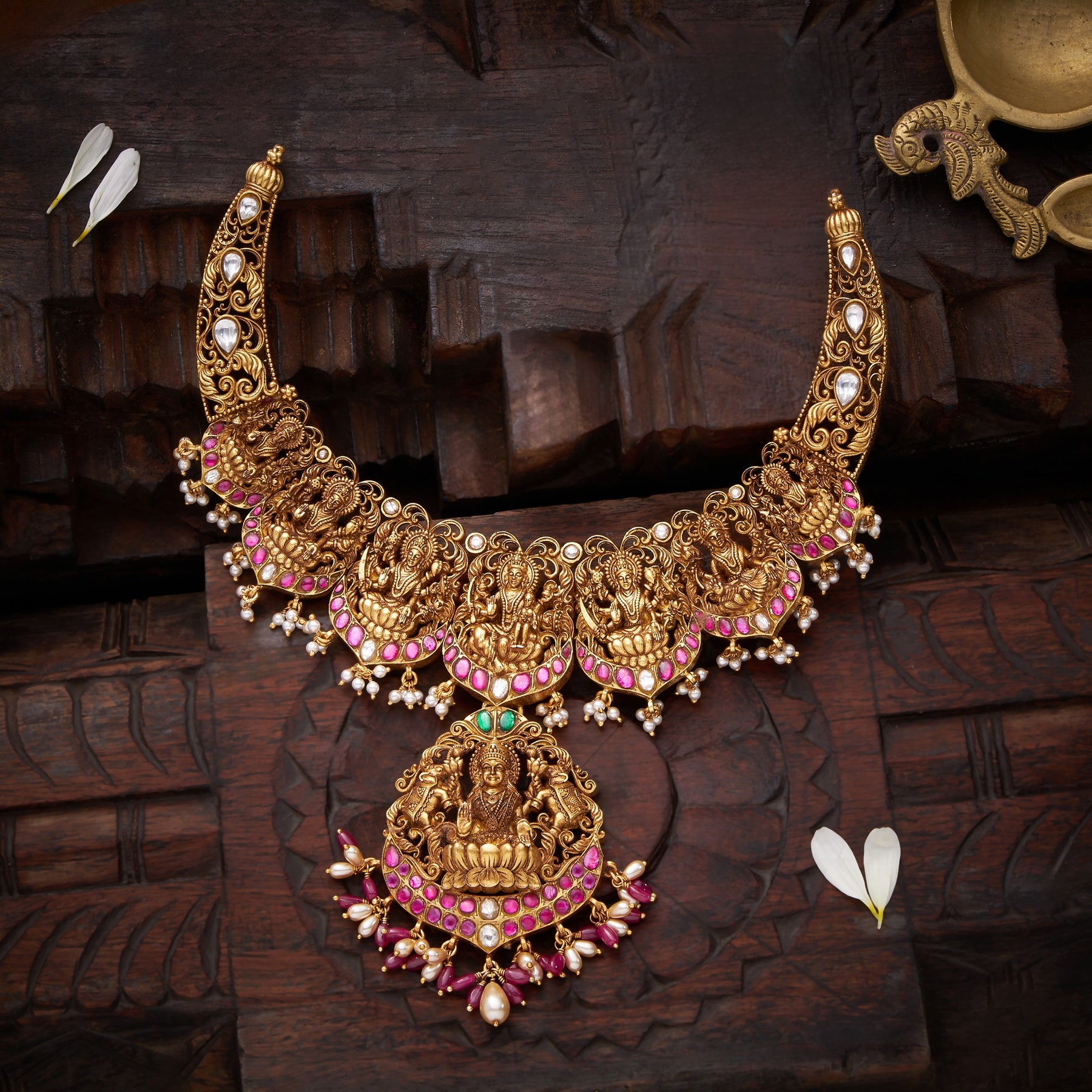Dhanamaya Temple Necklace features exquisite Lakshmi and Elephant motifs, symbolizing prosperity and divine grace. Crafted with intricate Kundan setting, this piece combines traditional artistry with refined elegance. Pearl and Ruby drops add luminous depth, creating a sophisticated interplay of light and color. Perfect for festive occasions and spiritual celebrations, this necklace merges cultural heritage with contemporary jewellery design. An investment piece that honours timeless craftsmanship.