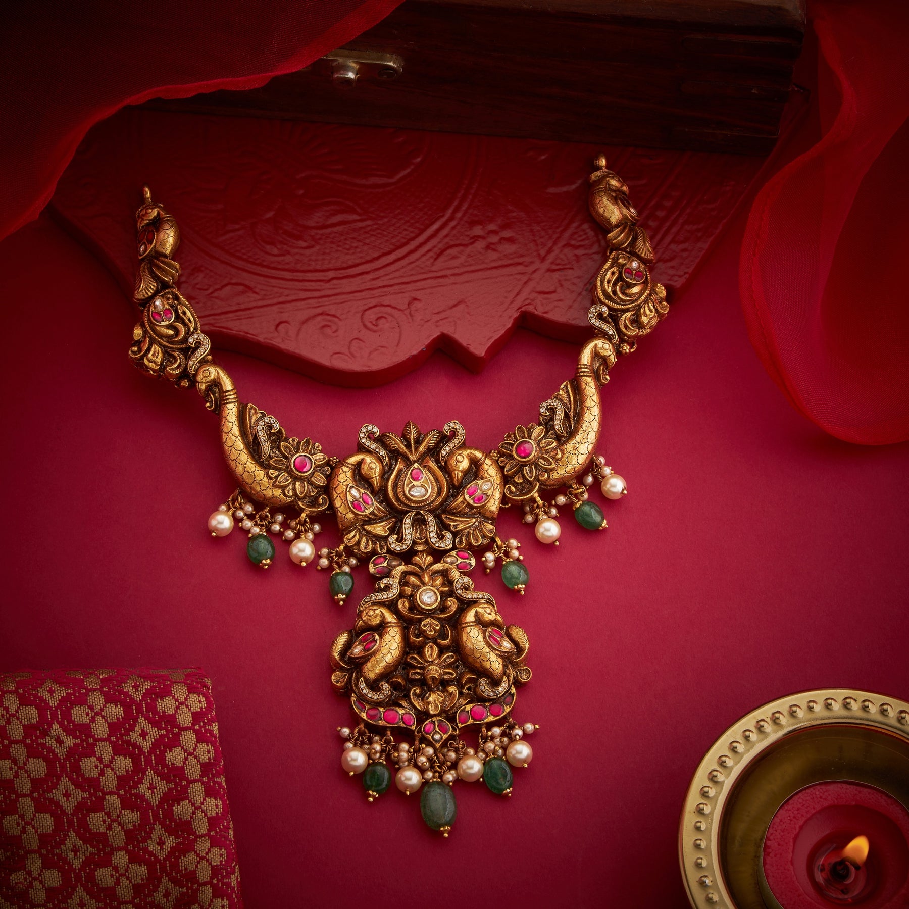 The Neelprabha Necklace showcases intricate Peacock and Floral motifs adorned with lustrous Kundan work, creating a statement piece rooted in traditional craftsmanship. Delicate Green bead and Pearl hangings cascade gracefully, adding movement and dimension to the design. Each element is meticulously placed to capture light and enhance the necklace's regal appeal. Perfect for festive occasions and celebrations, this piece combines timeless artistry with sophisticated elegance, making it an essential addition to any jewellery collection.