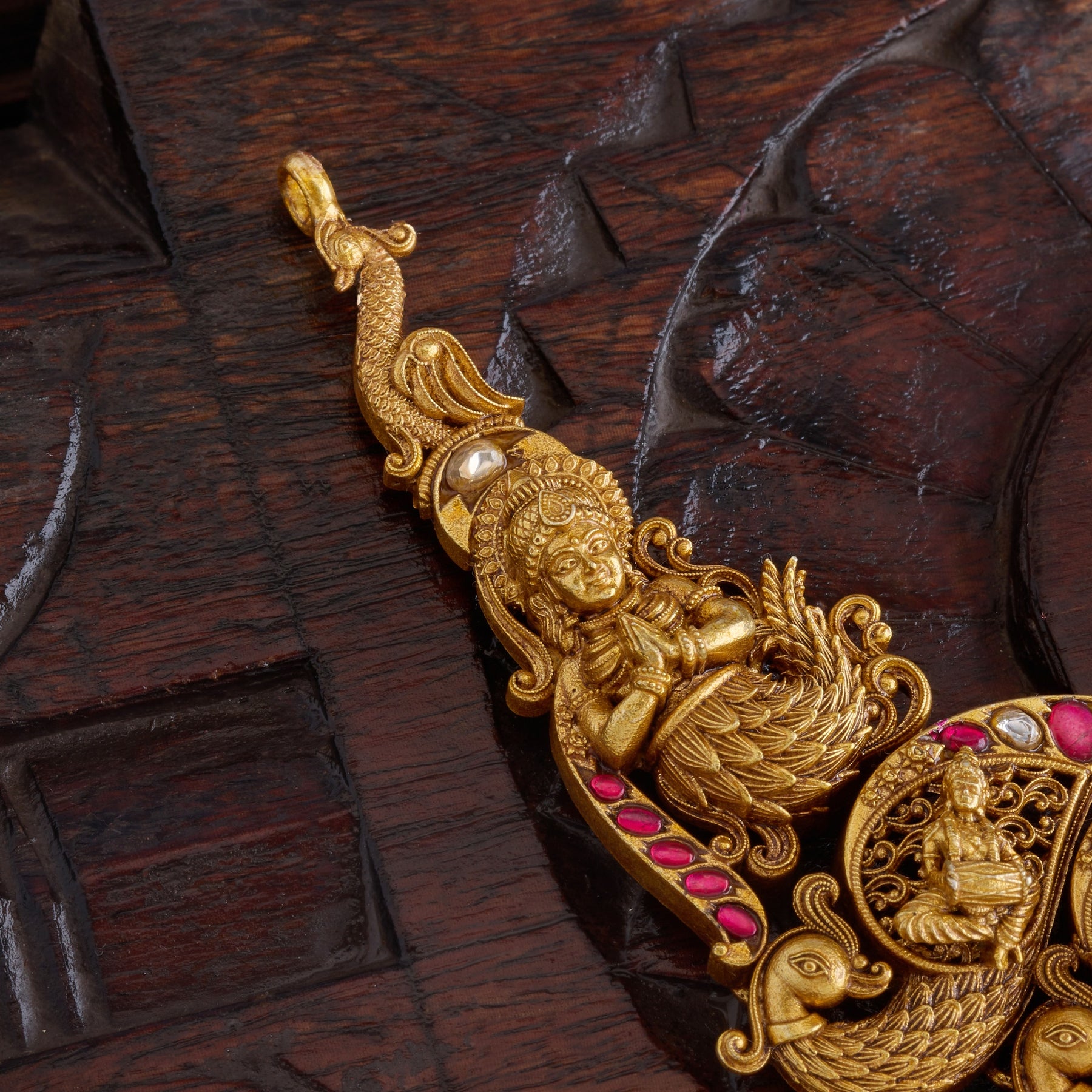 The Shree Anugraha Necklace is a masterfully crafted piece that celebrates divine prosperity and grace. Featuring an exquisite Lakshmi in coin shape, adorned with intricate Peacock and Devata motifs, this necklace exemplifies traditional artistry. The Kundan setting showcases lustrous Rubies, complemented by luminous Pearls and vibrant Emeralds that cascade as elegant hangings. Each element is thoughtfully positioned to create a harmonious composition that honours sacred symbolism while delivering sophisticated wearability. Perfect for festive occasions and spiritual celebrations, this necklace merges heritage craftsmanship with timeless elegance.