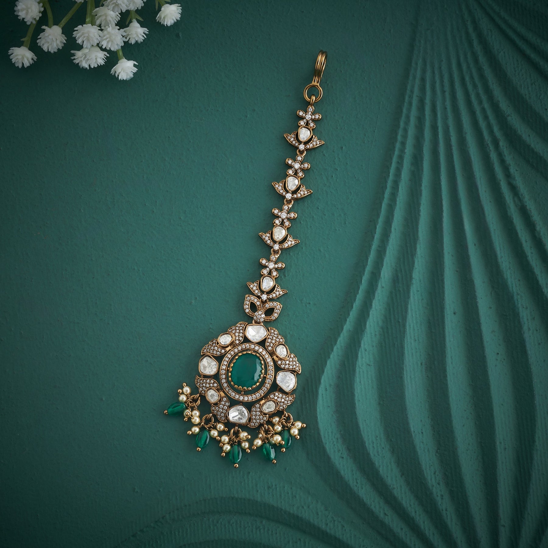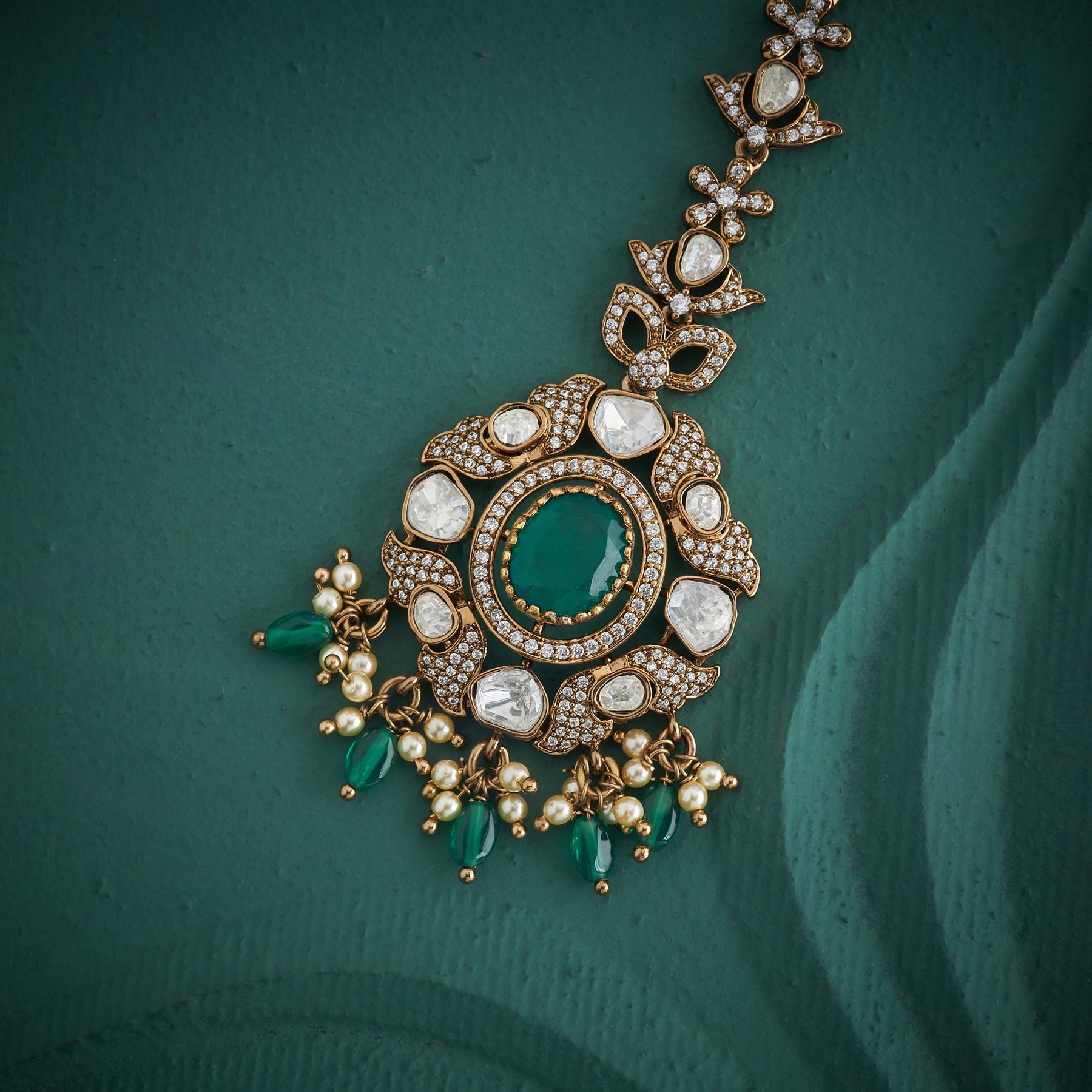 Bloomia Victorian Tikka is an exquisite piece that marries timeless elegance with intricate craftsmanship. Adorned with a delicate Floral silhouette, this tikka features a harmonious blend of Moissanites and Cubic Zirconia stones that catch light beautifully, complemented by rich Green stones and lustrous Pearls. Graceful Green bead drops cascade from the design, adding movement and dimension. Perfect for weddings, celebrations, or special occasions, this sophisticated accessory brings vintage-inspired charm with contemporary sparkle to your ensemble.