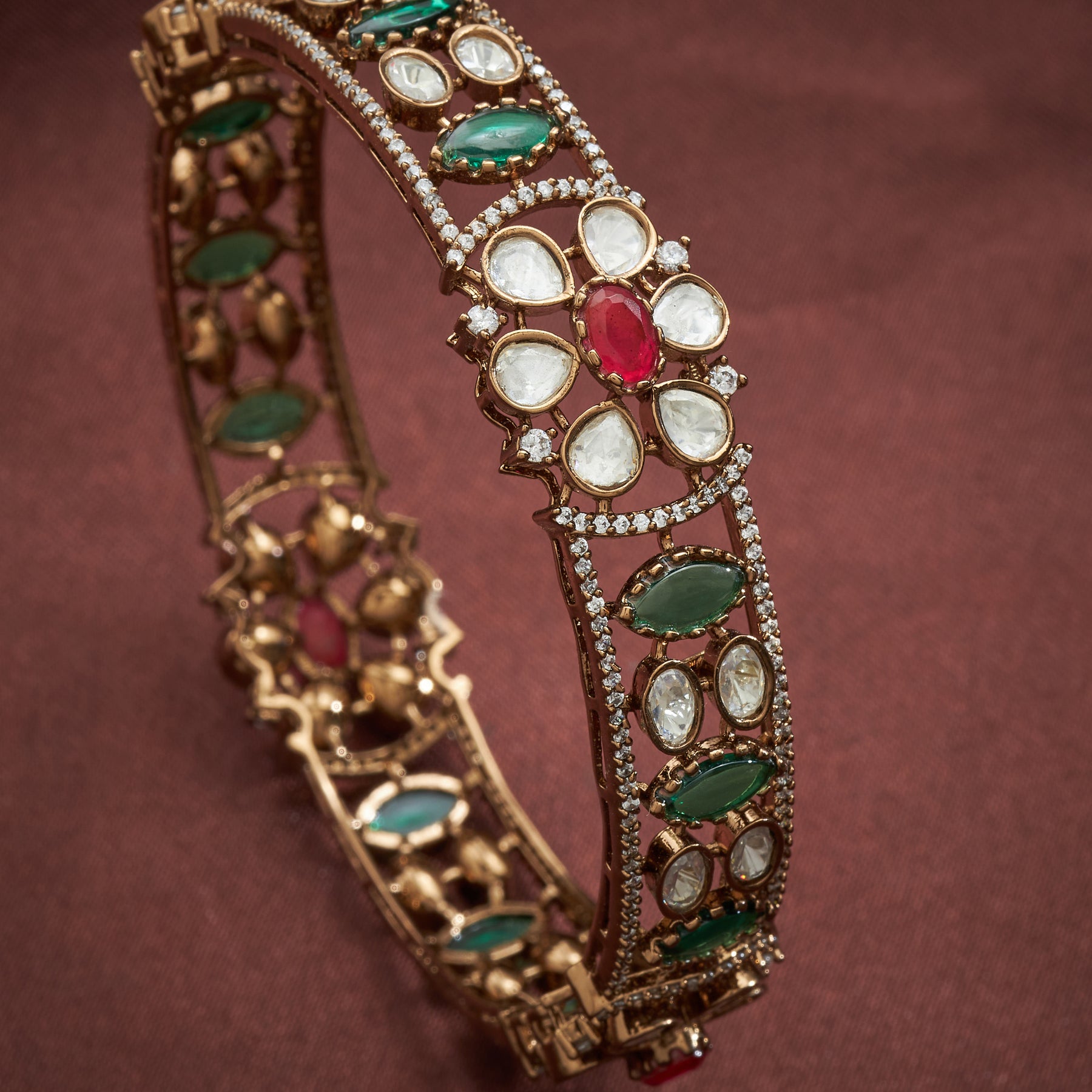 Florya Victorian Bangles showcase timeless elegance through their thoughtfully curated design. Each bangle features an Oval silhouette adorned with delicate Floral motifs, combining aesthetic sophistication with versatile styling. The collection incorporates Green stones, rich Ruby accents, and brilliant Moissanite alongside sparkling Cubic Zirconia, creating a balanced interplay of colour and luminosity. This combination delivers the appearance of fine jewellery. Perfect for layering or wearing individually, these bangles transition seamlessly from casual occasions to formal events, offering both visual impact and lasting durability.
