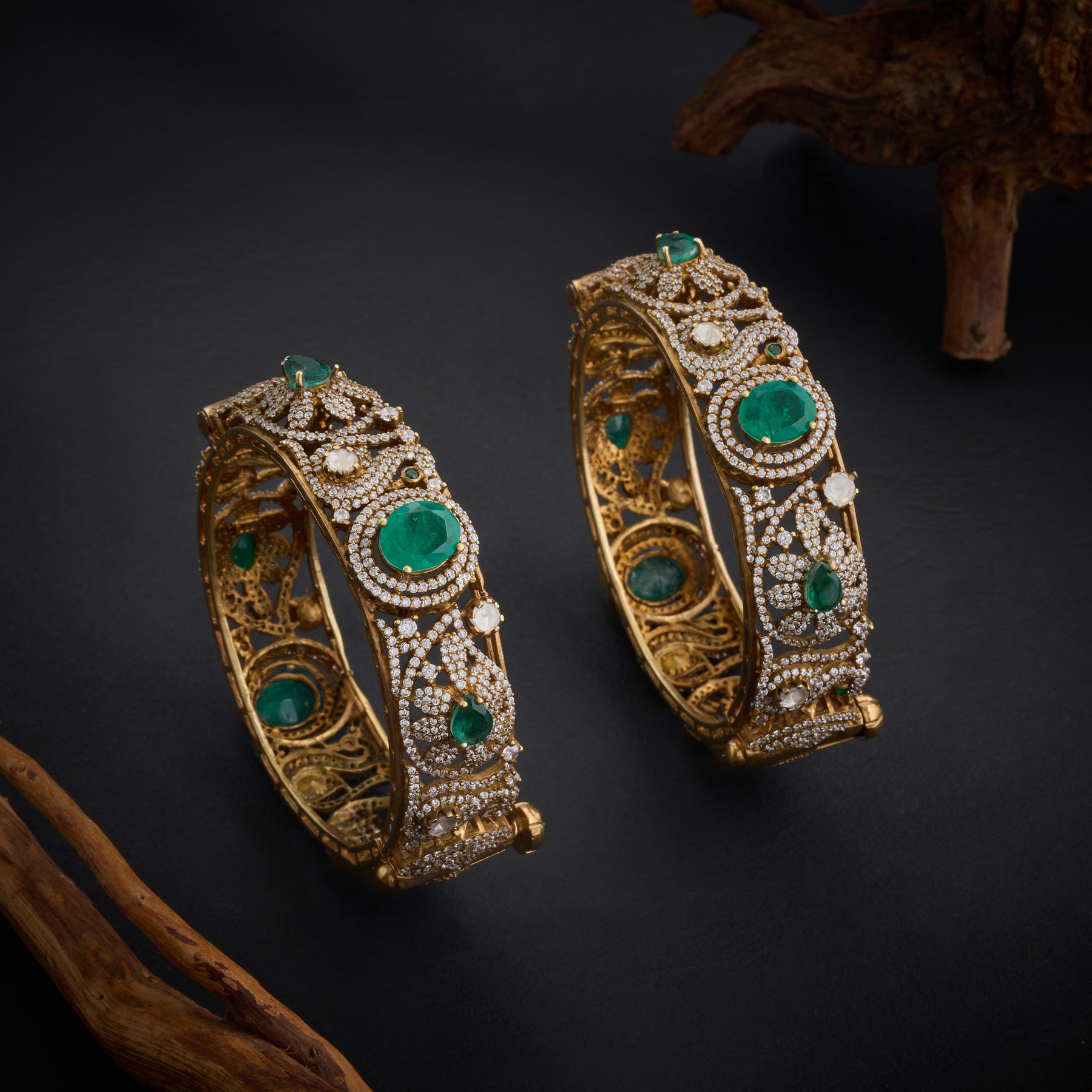 Elevate your wrist with these exquisite Victorian-inspired bangles, where graceful Swan Motifs dance across lustrous silver. Each piece features a harmonious blend of sparkling CZ stones, brilliant Moissanites, and verdant Green stones that capture light with timeless elegance. The intricate detailing and refined craftsmanship make these bangles a sophisticated statement for special occasions. Perfect for those who appreciate ornate design with a touch of nature-inspired beauty.