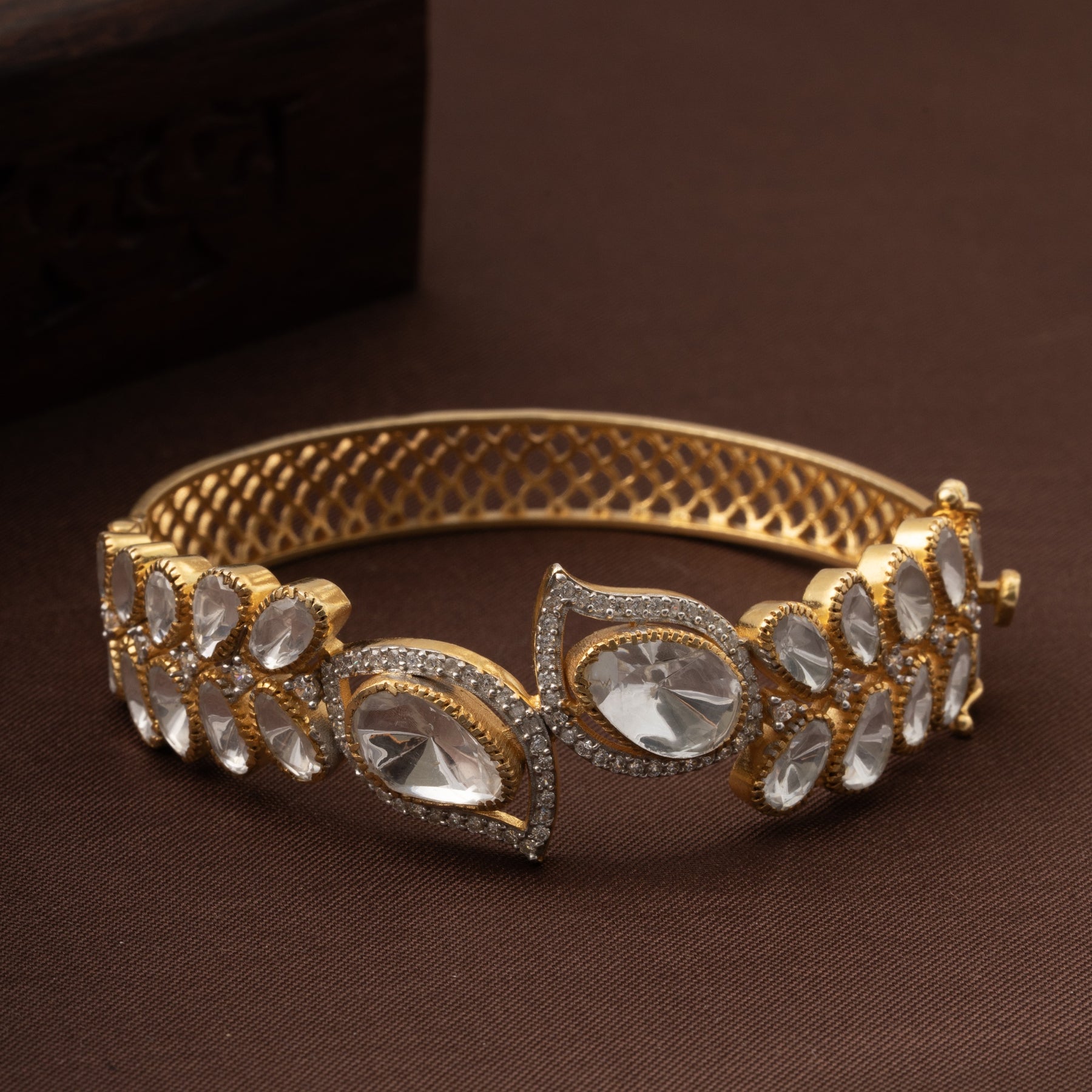 Elegant kada crafted in 92.5 sterling silver with luxurious 24kt gold polish. Features expertly designed Moissanites and CZ Stones that sparkle with brilliant radiance. BIS hallmark certified for authentic silver purity. Perfect for adding a touch of sophistication to your special occasions. The timeless design combines traditional craftsmanship with modern elegance, making it a versatile addition to any jewellery collection.