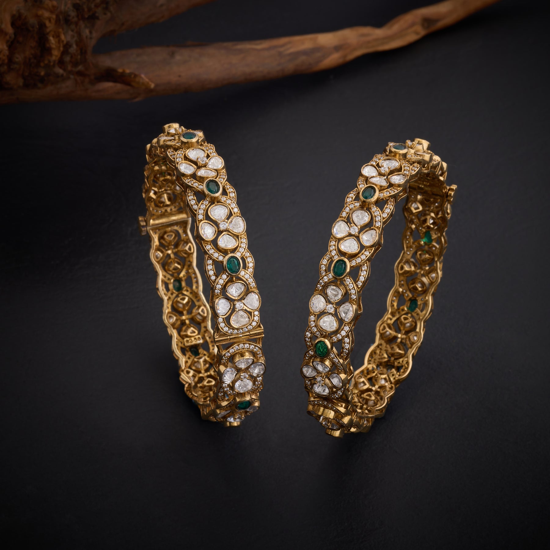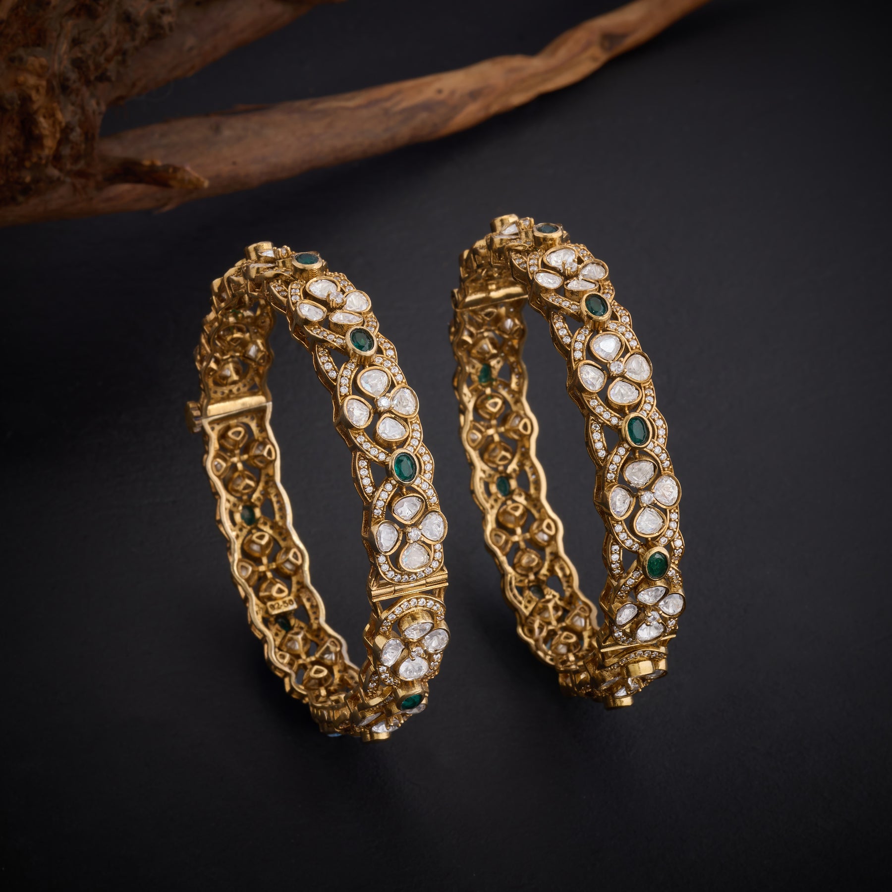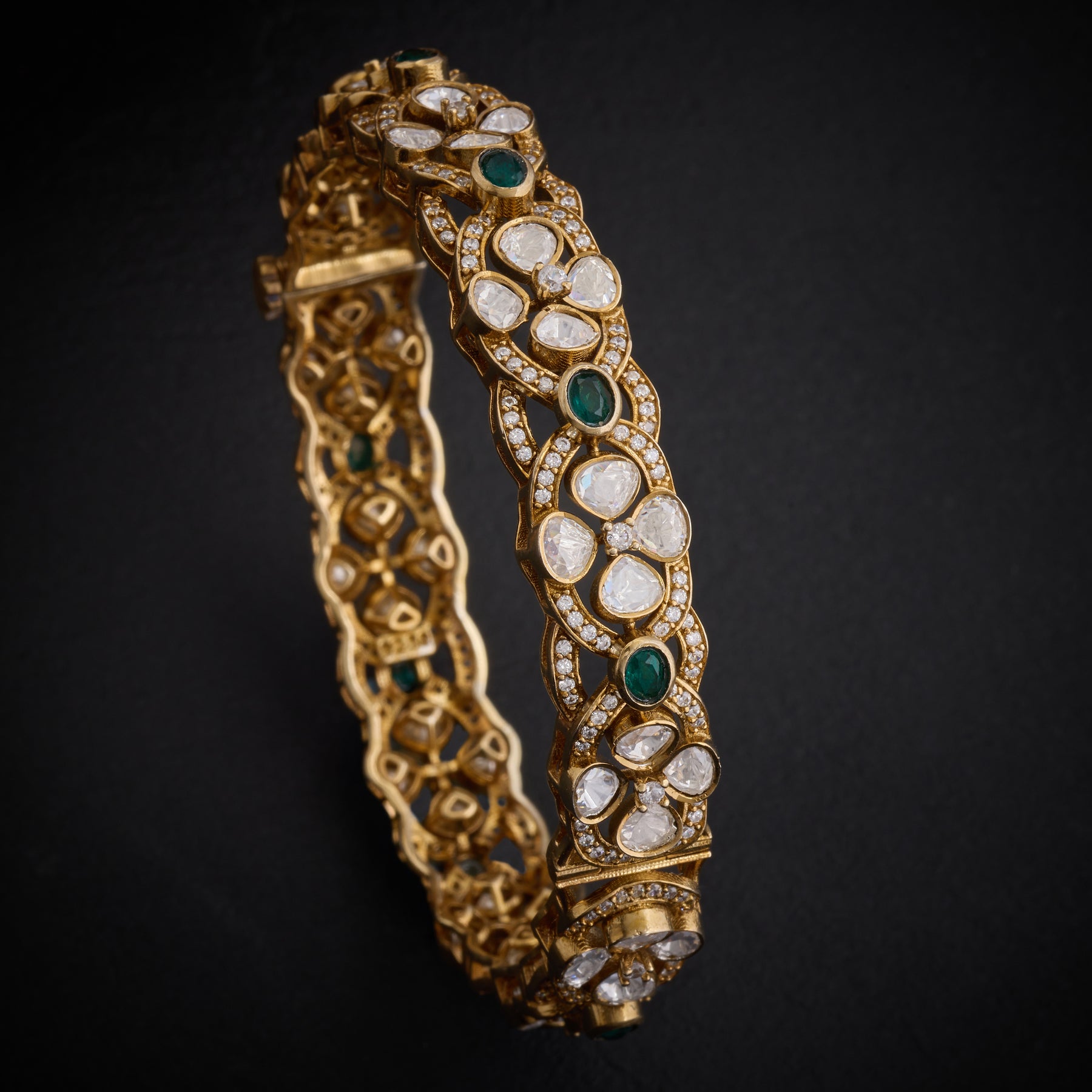 Victorian-Bloom Bangles showcase timeless elegance with intricate Floral motifs that capture the romance of a bygone era. Each piece features lustrous Green stones paired with brilliant Moissanites, creating a harmonious interplay of color and sparkle. The sophisticated design celebrates nature's beauty through ornate detailing, making these bangles an ideal choice for those who appreciate refined craftsmanship and classic aesthetics. Perfect for special occasions.