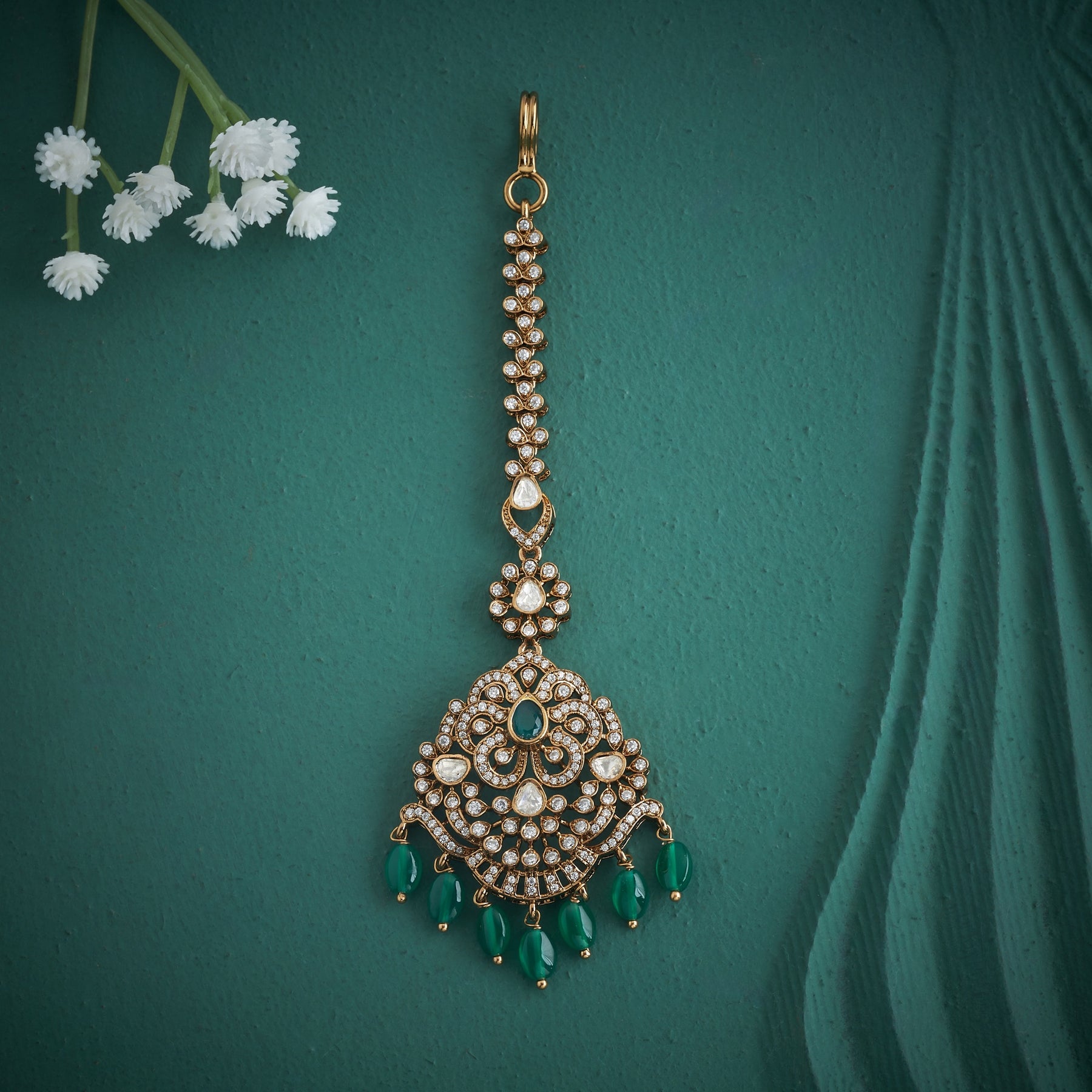 Yogira Victorian Tikka combines timeless elegance with intricate craftsmanship. This sophisticated piece features Moissanite stones that catch light with natural brilliance, paired with delicate Green beads that add graceful movement. The Victorian-inspired design brings a regal touch to traditional wear, making it an ideal choice for weddings, celebrations, and special occasions. Each detail reflects meticulous artistry, ensuring you stand out with understated luxury and refined beauty.