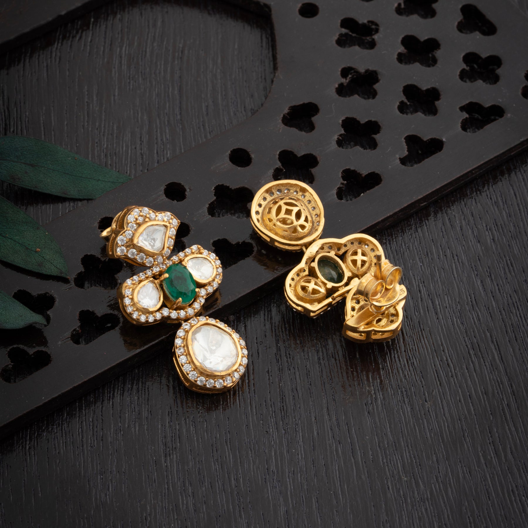 Leafy Victorian Danglers showcase intricate craftsmanship with Emerald, Moissanite, and Cubic Zirconia stones set in a refined design. The combination of semi precious gemstones delivers sophisticated sparkle with lasting durability. Perfect for those seeking vintage-inspired elegance with contemporary quality, these danglers transition seamlessly for special occasions. The carefully curated stone selection ensures both brilliance and value, making them an investment piece that complements any collection.