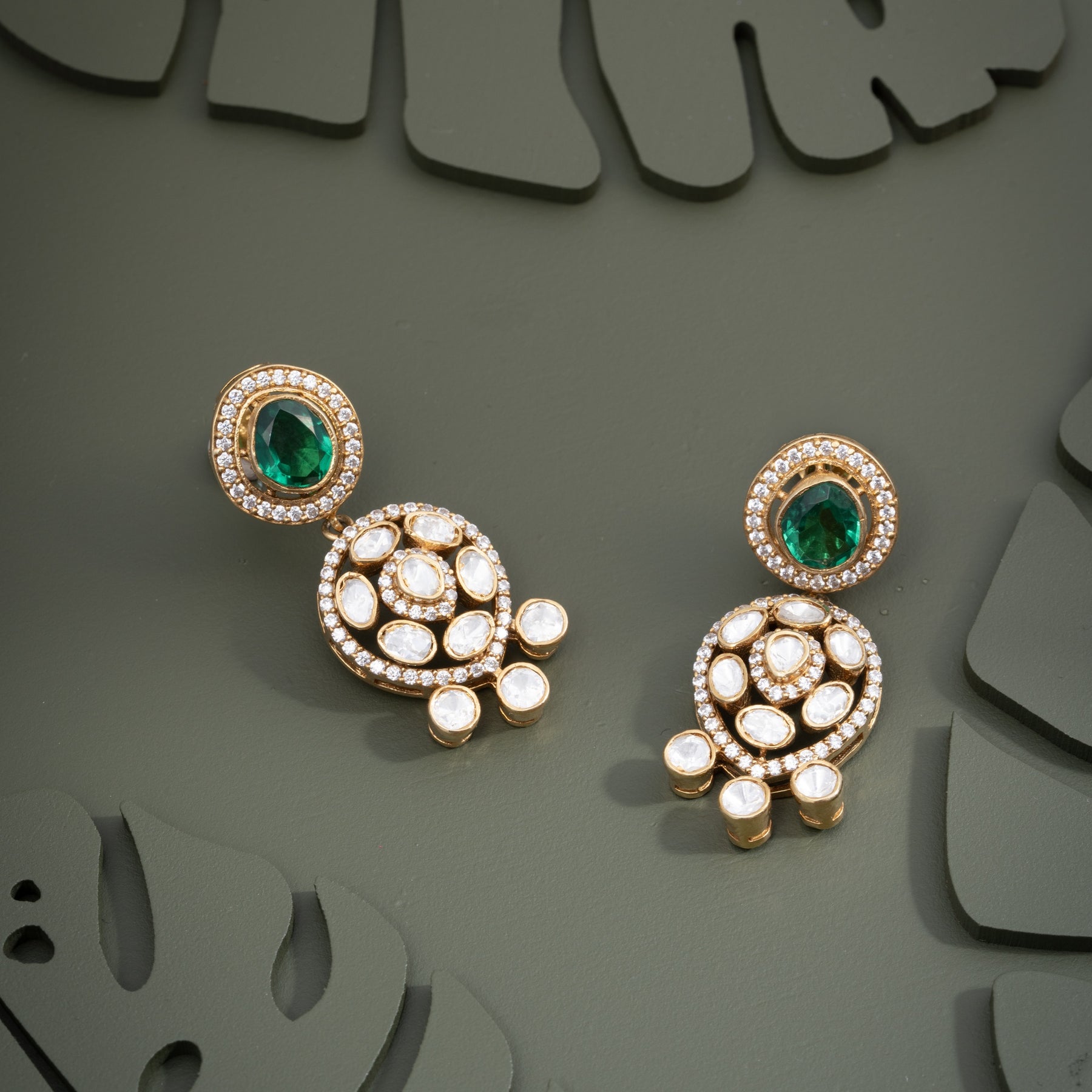 Rajnigandha Victorian Danglers showcase timeless elegance with intricate Floral motif that capture the essence of classic design. These sophisticated earrings feature verdant Green Stone complemented by sparkling CZ Stones and Moissanite accents, creating a luminous interplay of light and color. The Victorian-inspired craftsmanship delivers refined beauty perfect for special occasions wear. Each dangle moves gracefully, adding movement and dimension to your ensemble with understated luxury.