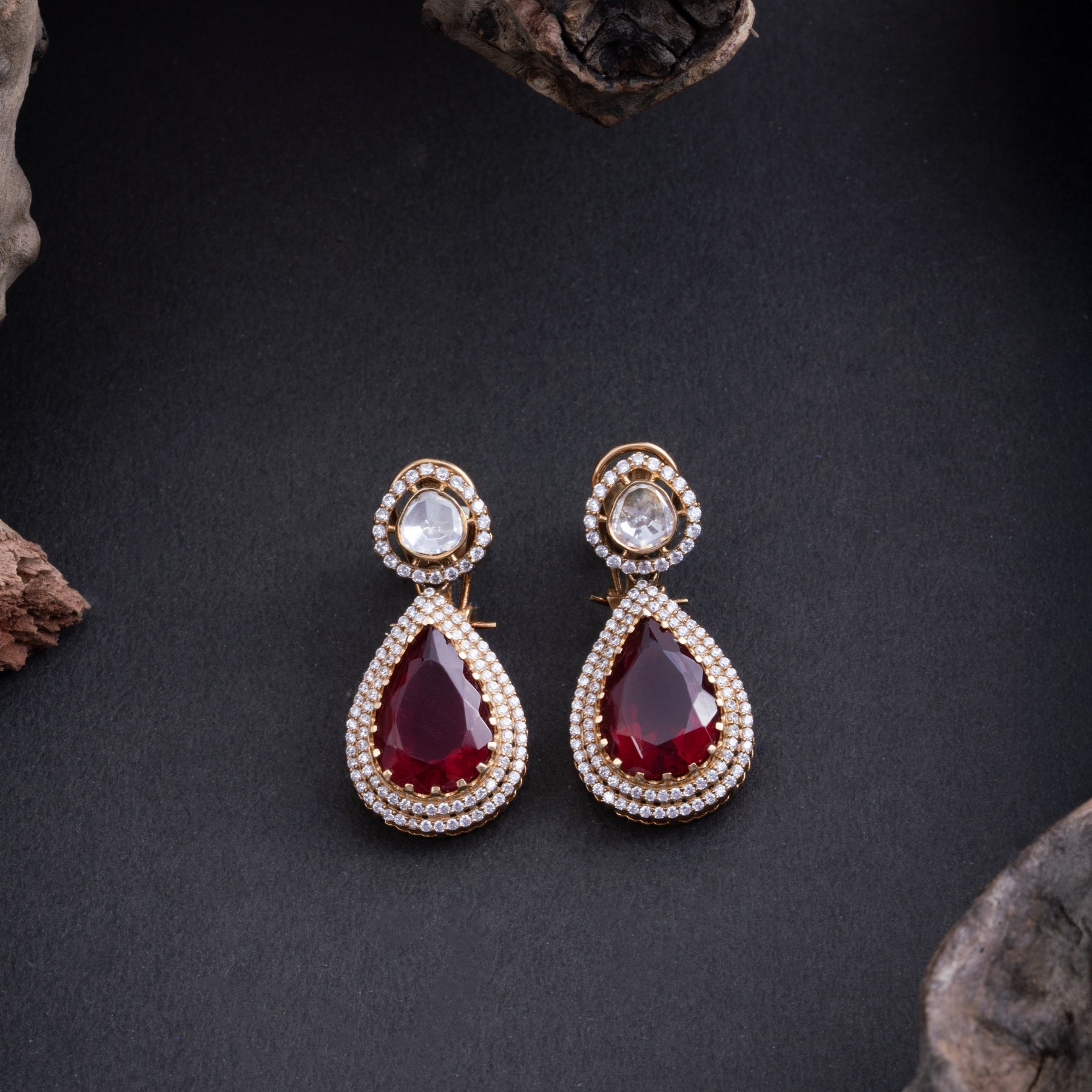 Ruby Trilia Danglers feature an elegant design crafted with lustrous Pear-shaped stones complemented by vibrant Ruby accents and sparkling Cubic Zirconia embellishments. This sophisticated piece combines traditional craftsmanship with contemporary styling, offering a refined aesthetic for special occasions. The interplay of gemstones creates a dynamic visual appeal while maintaining timeless sophistication.