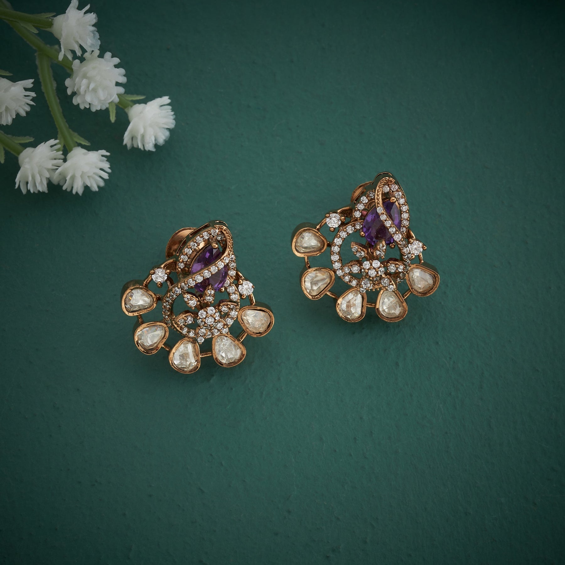 Kanvitha Victorian Necklace Set presents refined luxury through its masterful fusion of heritage design and semi precious gemstones. Featuring lustrous Purple Amethyst stones set in exquisite Moissanite work, this necklace exudes regal sophistication. The centerpiece showcases an ornate Floral pendant that serves as the focal point, adding dimensional elegance to the composition. Ideal for special celebrations, formal events, or collectors of fine Victorian jewellery, this set demonstrates exceptional craftsmanship with its intricate detailing and harmonious colour palette. The deep Purple hues paired with traditional Moissanite settings create a captivating piece that transcends seasonal trends.