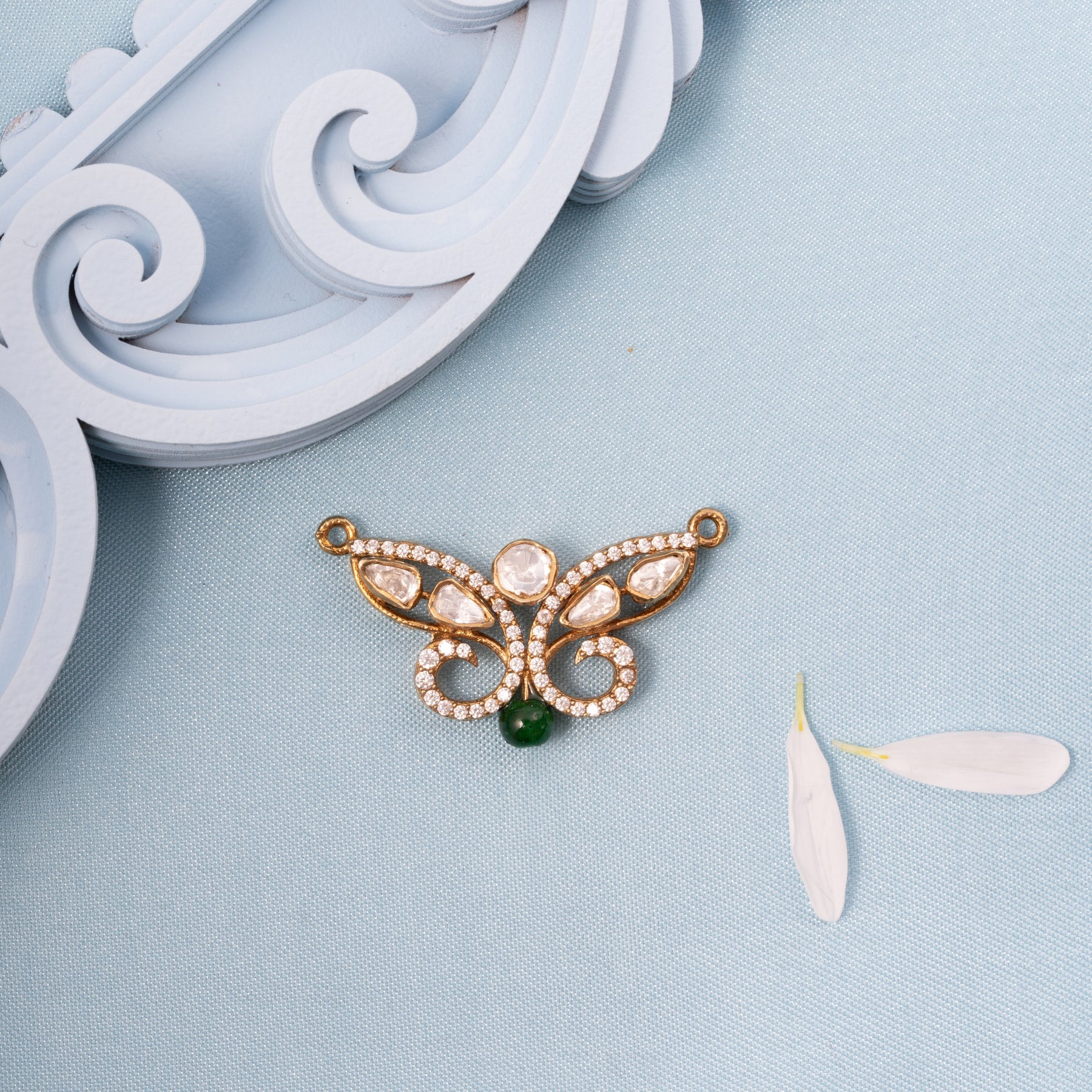 Embrace timeless elegance with this exquisite Butterfly Victorian Pendant, a masterpiece that captures nature's delicate beauty. Meticulously crafted with a graceful Butterfly silhouette, this pendant features brilliant CZ stones and shimmering Moissanites that dance with light, complemented by a striking Green drop that adds depth and sophistication. The Victorian-inspired design evokes classic refinement, making it an ideal choice for those who appreciate ornate jewelry with contemporary sparkle. Perfect for special occasions or as a cherished everyday statement piece.