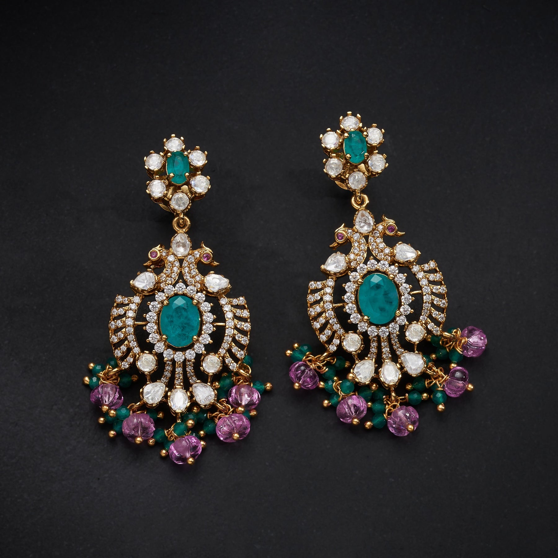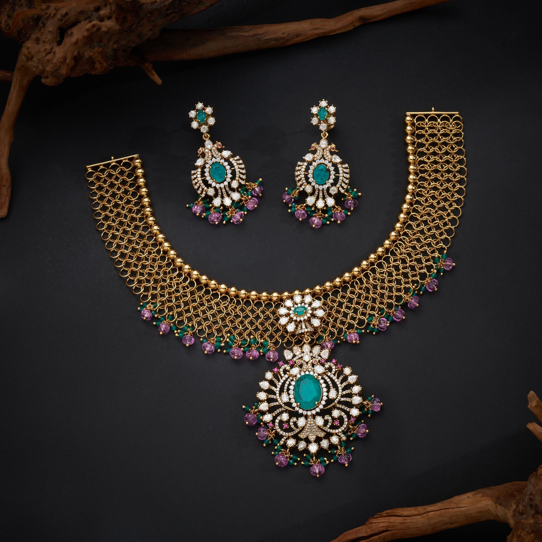 Emera Victorian Necklace Set combines timeless elegance with contemporary craftsmanship. This exquisite piece features intricate Floral detailing adorned with rich Emerald stones and brilliant CZ diamonds, complemented by lustrous Moissanite accents. Delicate Pink and Emerald drop elements cascade gracefully, creating a sophisticated silhouette perfect for special occasions.Ā The harmonious blend of gemstones delivers exceptional sparkle and depth, while the Victorian-inspired design ensures enduring style and versatility.