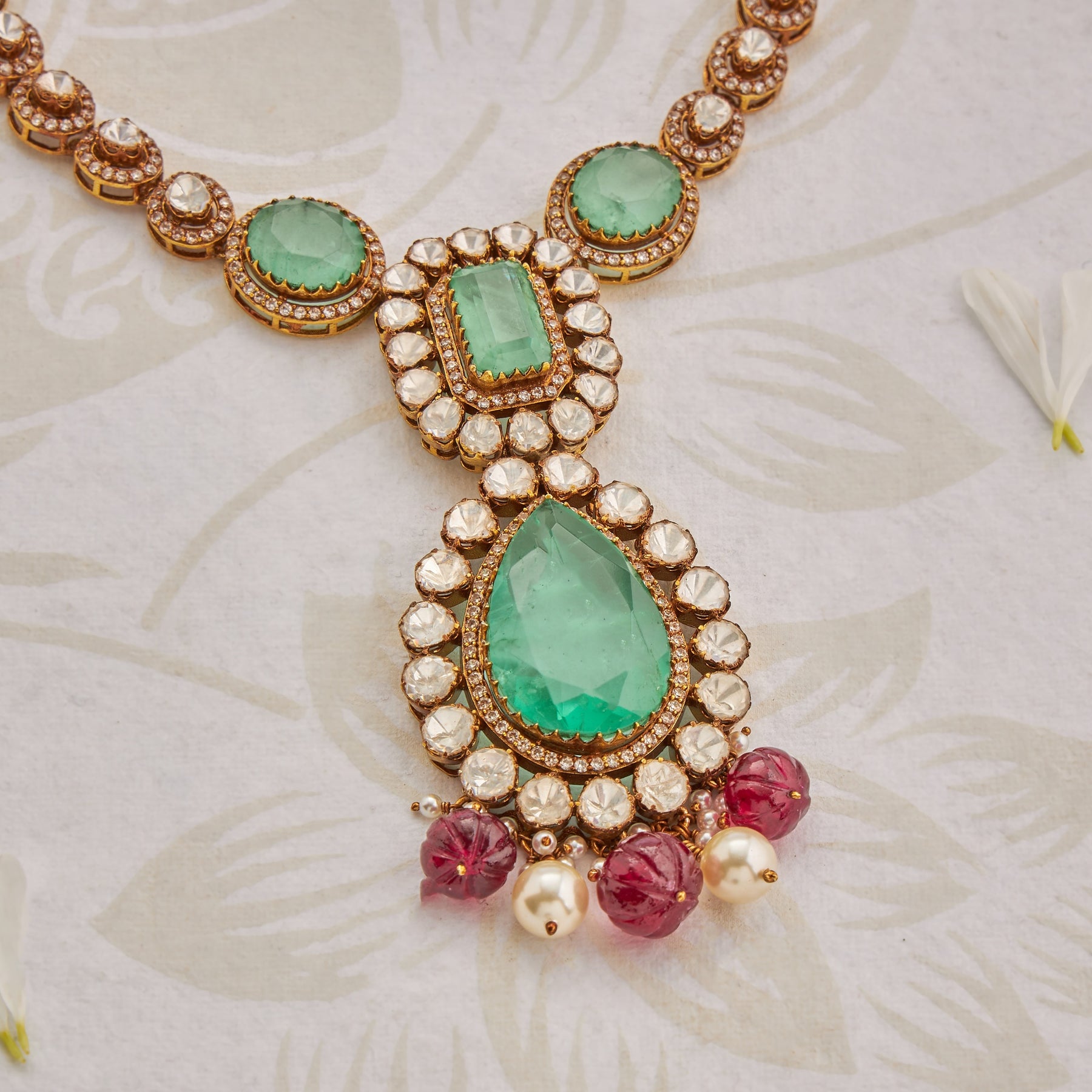 The Emerflora Necklace Set combines timeless elegance with sophisticated craftsmanship. This exquisite piece features lustrous Pearls and vibrant Red beads suspended gracefully alongside brilliant Moissanite and emerald accents. The Pear-shaped design elements create a distinctive silhouette that catches light beautifully, while the carefully curated gemstone combination offers both visual depth and refined luxury. Perfect for those who appreciate jewellery that balances traditional artistry with contemporary allure, this necklace set makes a compelling statement for special occasions.