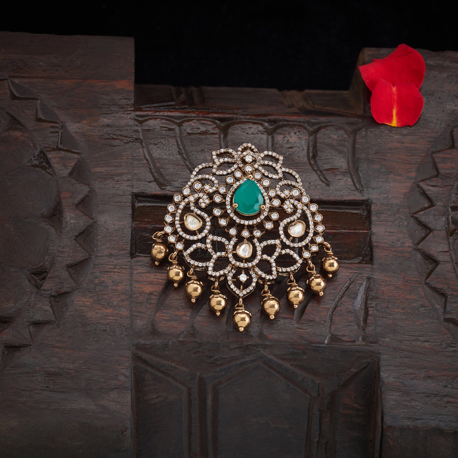 The Fairy Orchard Pendant Set showcases an expert blend of Pear, Floral, and Mango motifs, elegantly accented with sparkling CZ stones and Moissanite. At its heart lies a vibrant emerald center stone, complemented by delicate golden bead hangings that enhance its refined appeal. This set marries intricate design with high-quality gemstones for a sophisticated and captivating look.
