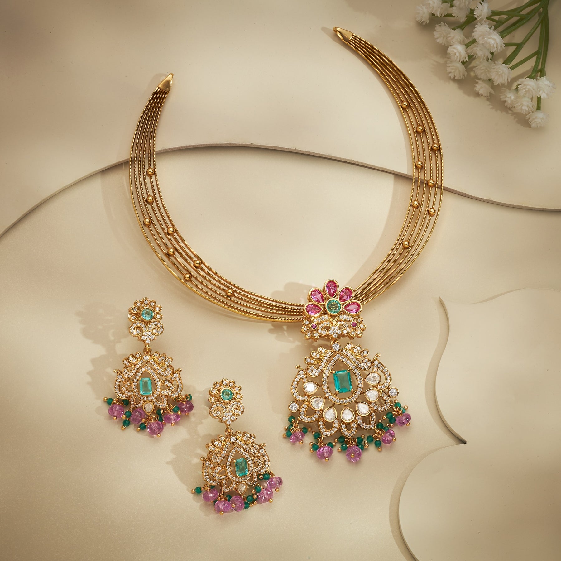 The Fleurie Victorian Necklace Set combines timeless elegance with contemporary sparkle. Crafted with meticulous attention to detail, this piece features a sophisticated Floral design adorned with brilliant Moissanite and Cubic Zirconia stones that catch light beautifully. Complementing the classic Floral are vibrant Green and Pink gemstones, enhanced by matching Green and Pink drop accents that add graceful movement and dimension. Perfect for those who appreciate intricate jewellery design with a romantic aesthetic, this necklace set delivers luxury appeal at an accessible price point.