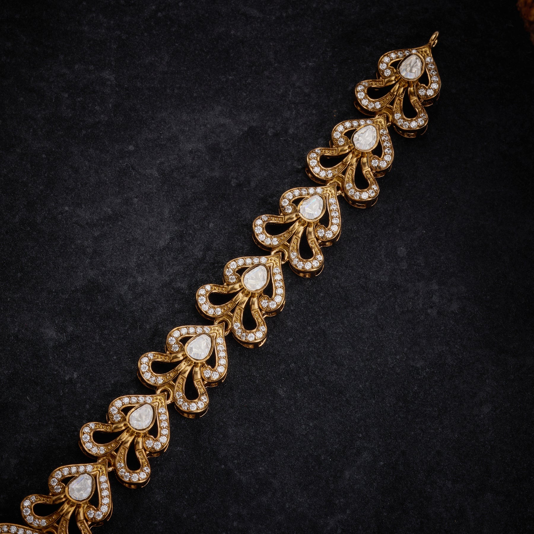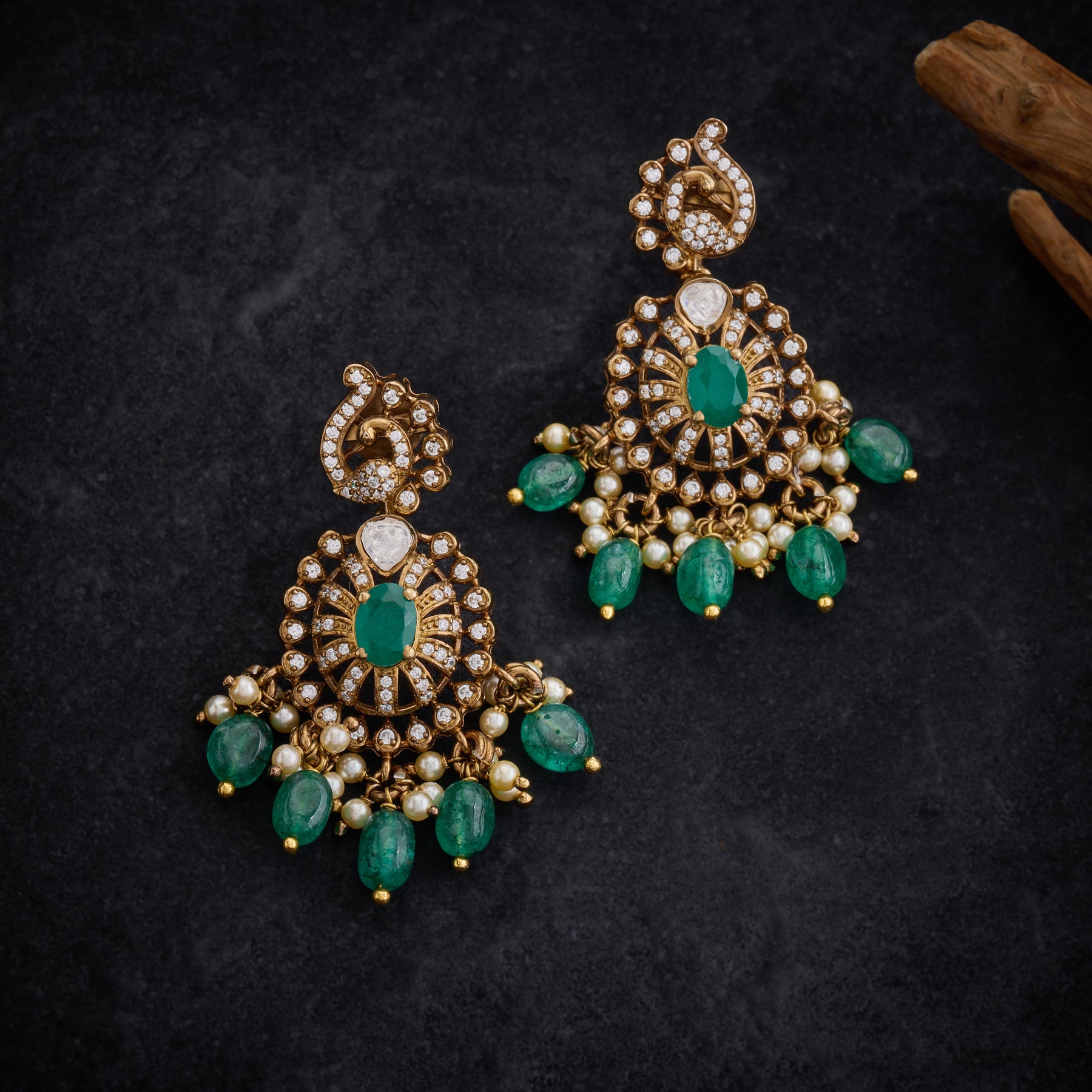 Floriella Victorian Necklace Set captures timeless elegance with its intricate Floral design adorned with sparkling CZ stones, luminous Moissanite, and rich Green stones. Delicate Green bead and Pearl hangings cascade gracefully, adding movement and dimension to this refined piece. Perfect for those who appreciate classic sophistication with a contemporary sparkle, this necklace set brings an air of vintage-inspired luxury to any occasion.
