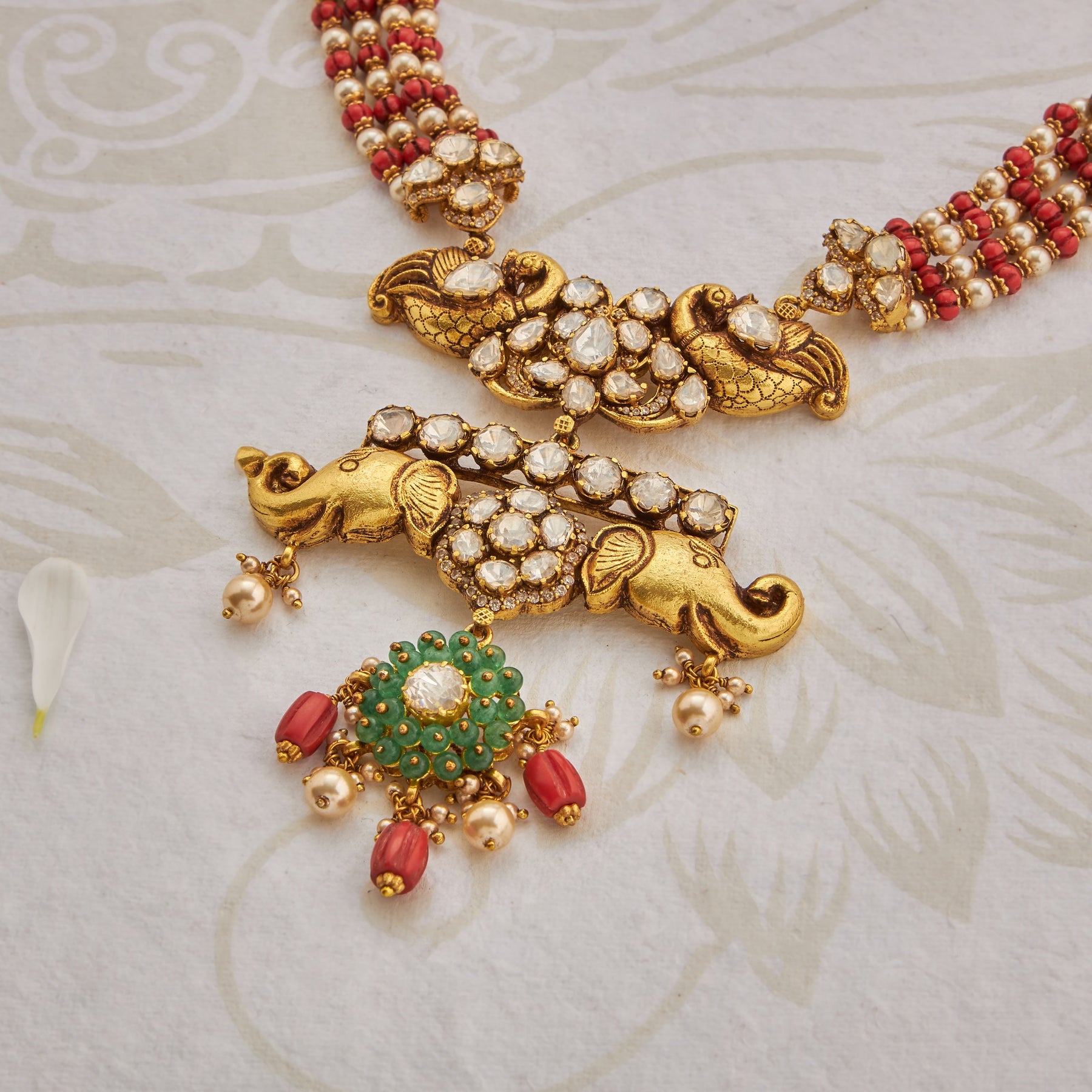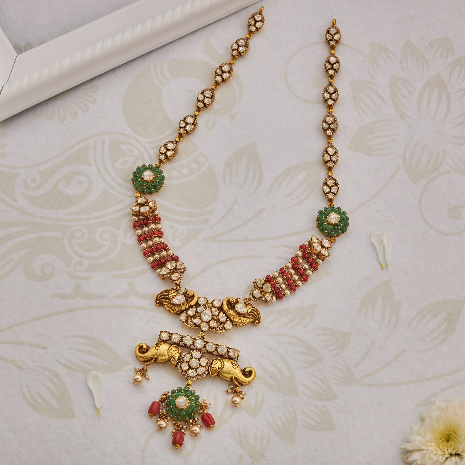 The Gajrajya Haaram combines traditional craftsmanship with contemporary elegance. This striking piece features intricate Elephant motifs paired with brilliant Moissanite stones, creating a luminous cenrepiece. Vibrant Red and Green beads add cultural richness and dynamic colour contrast, making this haaram a versatile choice for festive occasions and celebrations. The expert combination of materials ensures durability while maintaining the refined aesthetic that defines premium jewellery design.