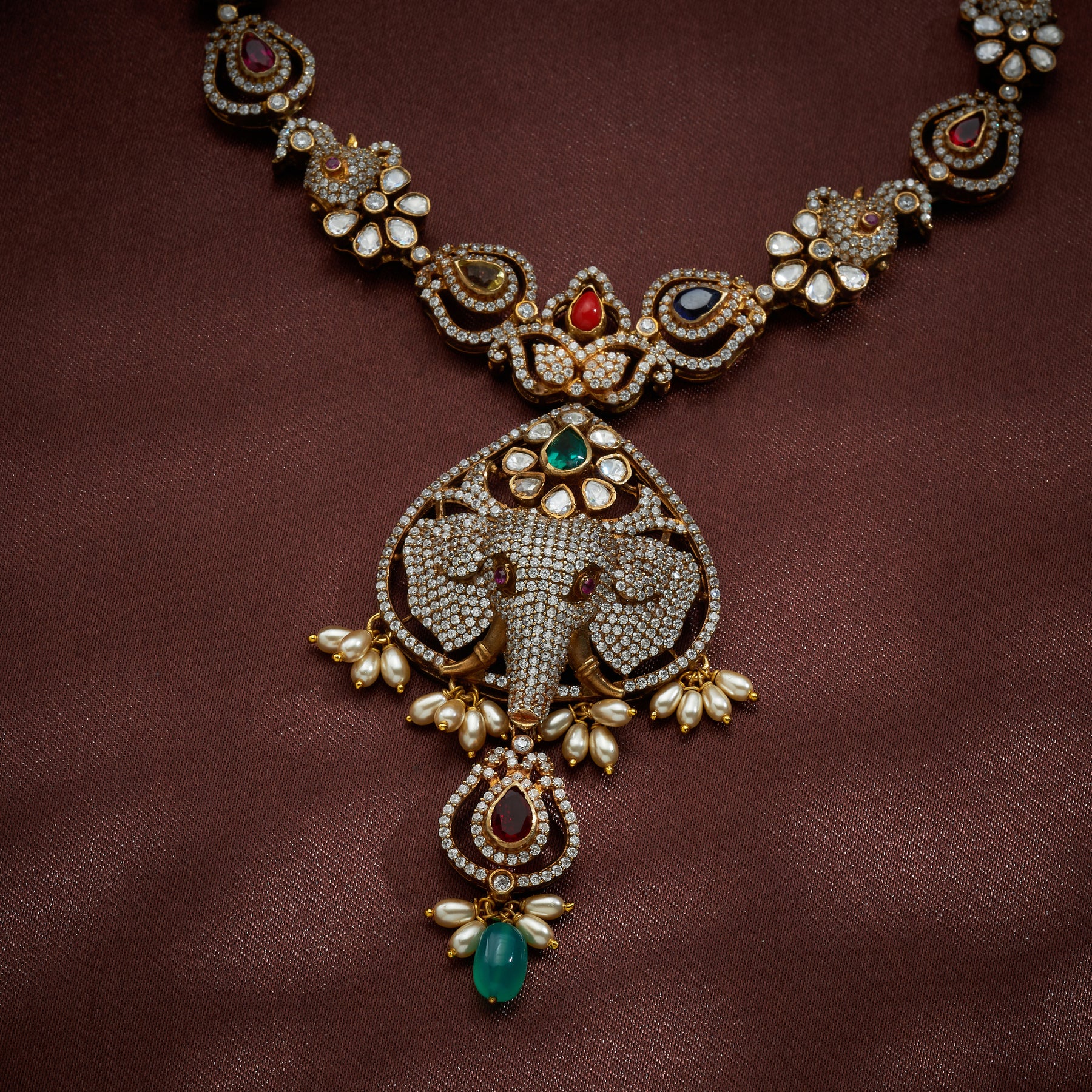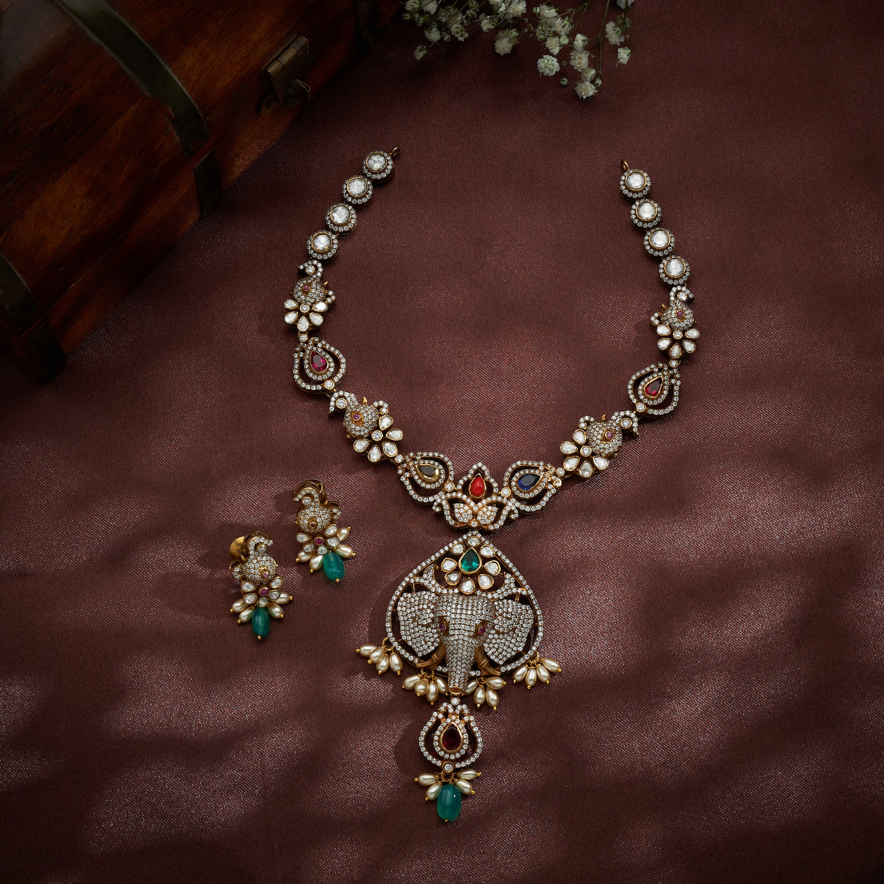 Hastikosha Necklace Set features an exquisite blend of traditional and contemporary design elements. Crafted with Elephant and Pear-shaped motifs, this piece incorporates Navaratna gemstones alongside lustrous CZ stones and Moissanite for brilliant sparkle. Complemented by vibrant Green beads and lustrous Pearls, the necklace creates a harmonious interplay of textures and hues. Each element is thoughtfully selected to deliver both aesthetic appeal and timeless elegance, making this set a versatile choice for festive occasions and special celebrations.